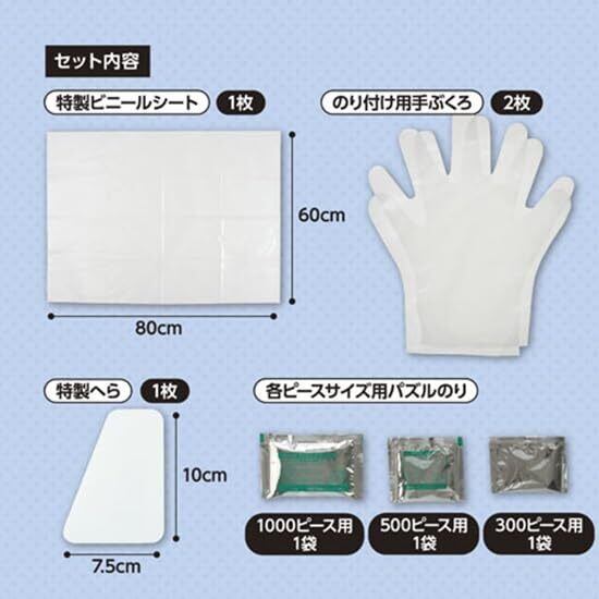 袋のり×3袋(300ピース用・500ピース用・1000ピース用)、ビニールシート×1枚、プラ製へら×1、ビニール手袋×2、説明書