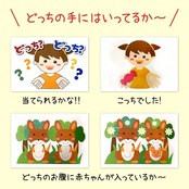 どっちの手にはいってるか~! 昔から受け継がれる手遊びです。シンプルですが、子供はドキドキしながら大盛り上がりで大好き。手の中のアメ、カンガルーの赤ちゃん、お弁当箱の中身、おもちゃ、お友達といろんなものがどちらに入っているか、出てくるかな? マジックテープでパーツを移動出来るので飽きてしまう事なく楽しく遊べます。