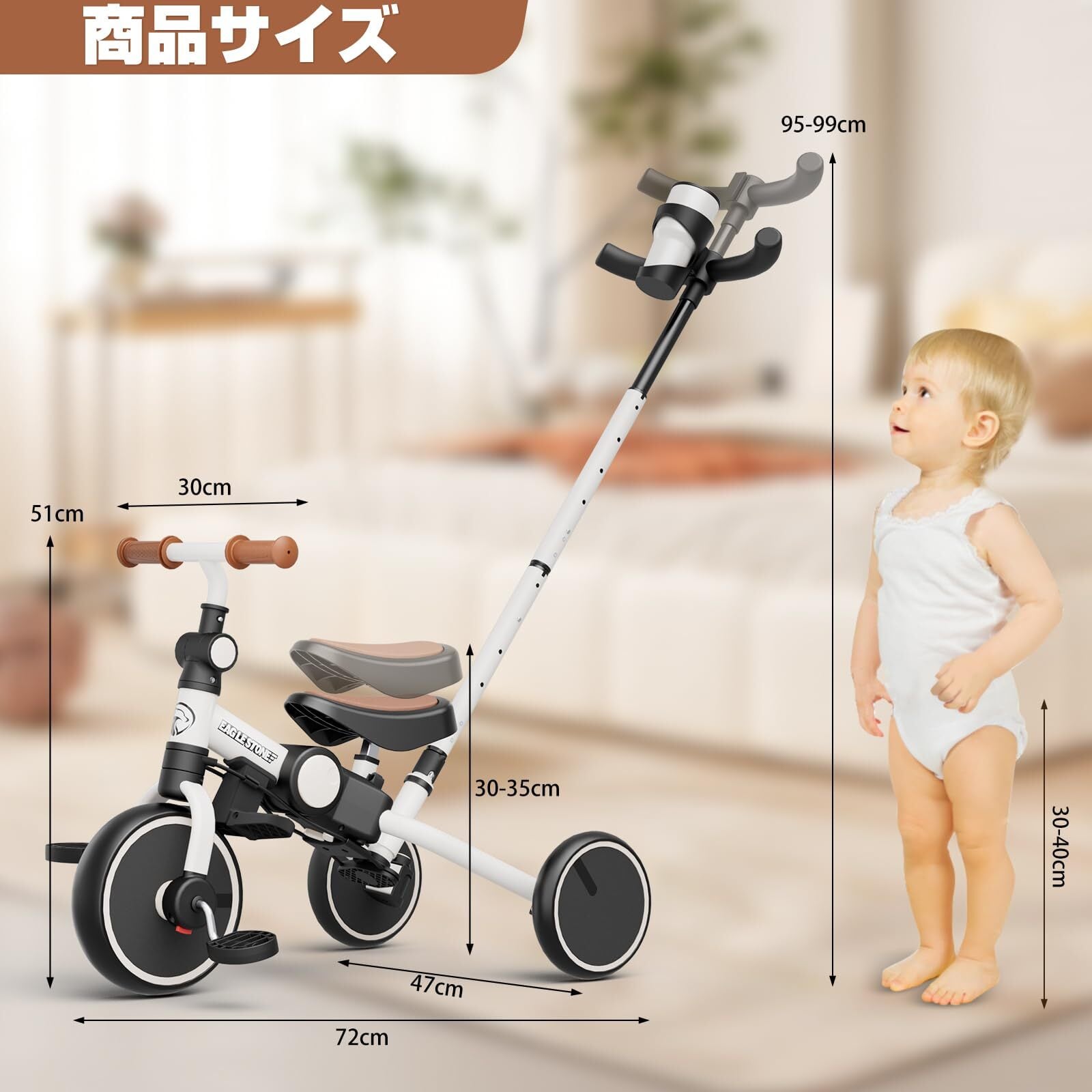 【調整可能なシート&着脱式および調整可能な押し手】座席の高さは30〜35cmに調整可能で、子供の成長に合わせて簡単に調整でき、快適さと安全を確保します。座る高さに応じて最適な位置を見つけ、ライディング体験を向上させます。押し手は着脱式および調整可能な設計より、高さは95〜99cmに調整可能で、親が簡単に操作でき、子供が独立して乗る際には簡単に取り外せます。
