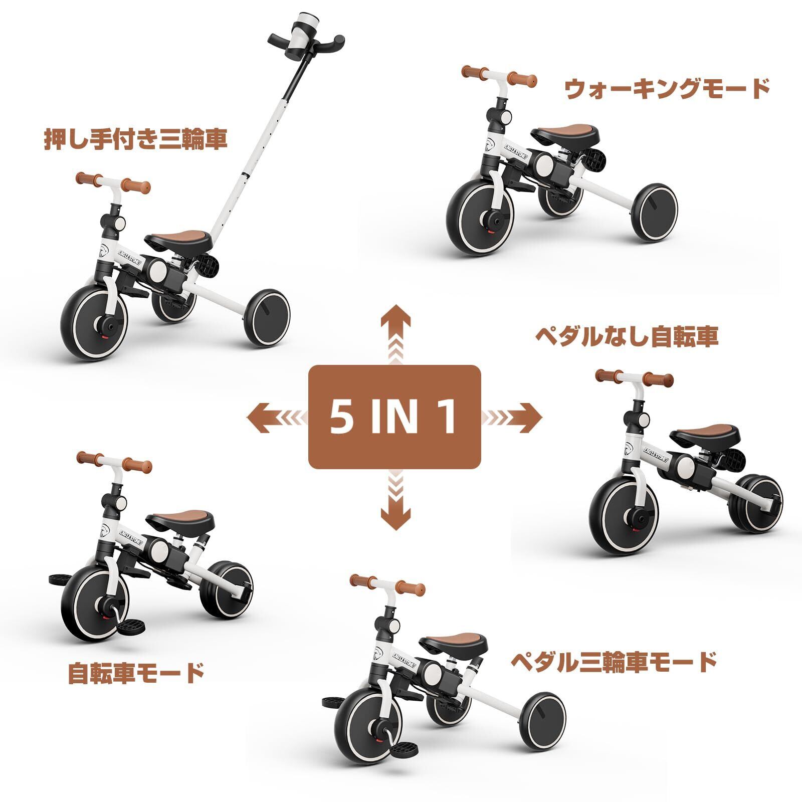 子供用三輪車 5in1 手押し棒付き おりたたみ式 手押し 多機能三輪車 キッズバイク おもちゃ ペダルなし自転車 乗用玩具 コンパクト収納 耐久性 調整可能 カップホルダーと風車付き 男の子 女の子 子供 誕生日 プレゼント 新年 贈り物 ギフト お祝い ES76 ホワイト