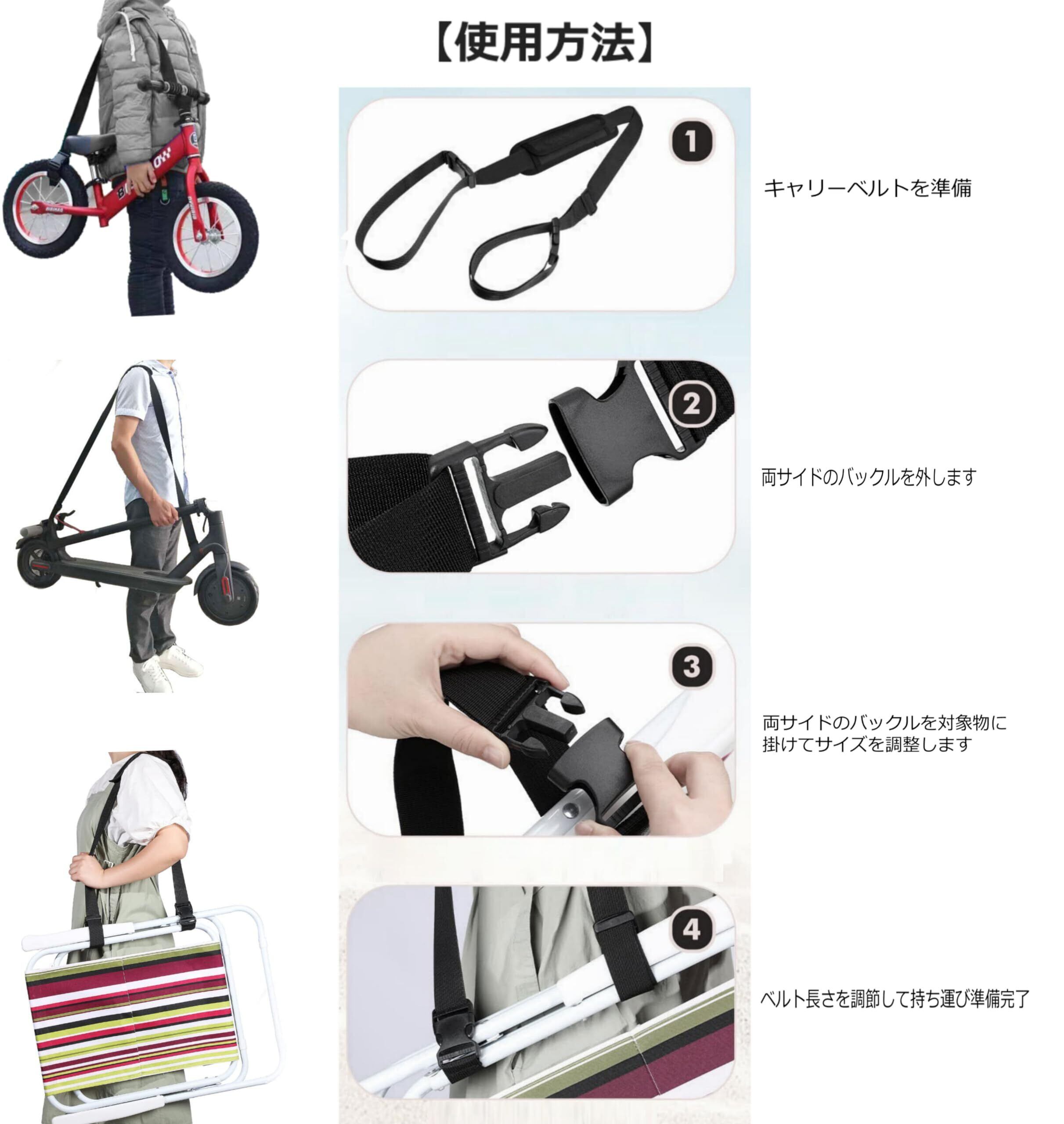 両端が輪っか状で、バックルでワンタッチで簡単に脱着が出来るキャリーベルトです。肩掛けタイプで、ストライダー・ペダル無し自転車 、へんしんバイク 、子供用自転車、 ベビーカー、折りたたみ式のキックボード、折りたたみ式自転車、アウトドアチェア、スポーツ用品、スケボー、三脚・トライポッド、写真・動画撮影用の装備・機材・スタンド、脚立・ラダー(はしご)、ヨガマット等の持ち運びに使用出来ます。 長めのクッション入り肩パッド付で重量負荷を分散して肩への負担を軽減、様々なアイテムの持ち運びが楽になるショルダーベルトです。