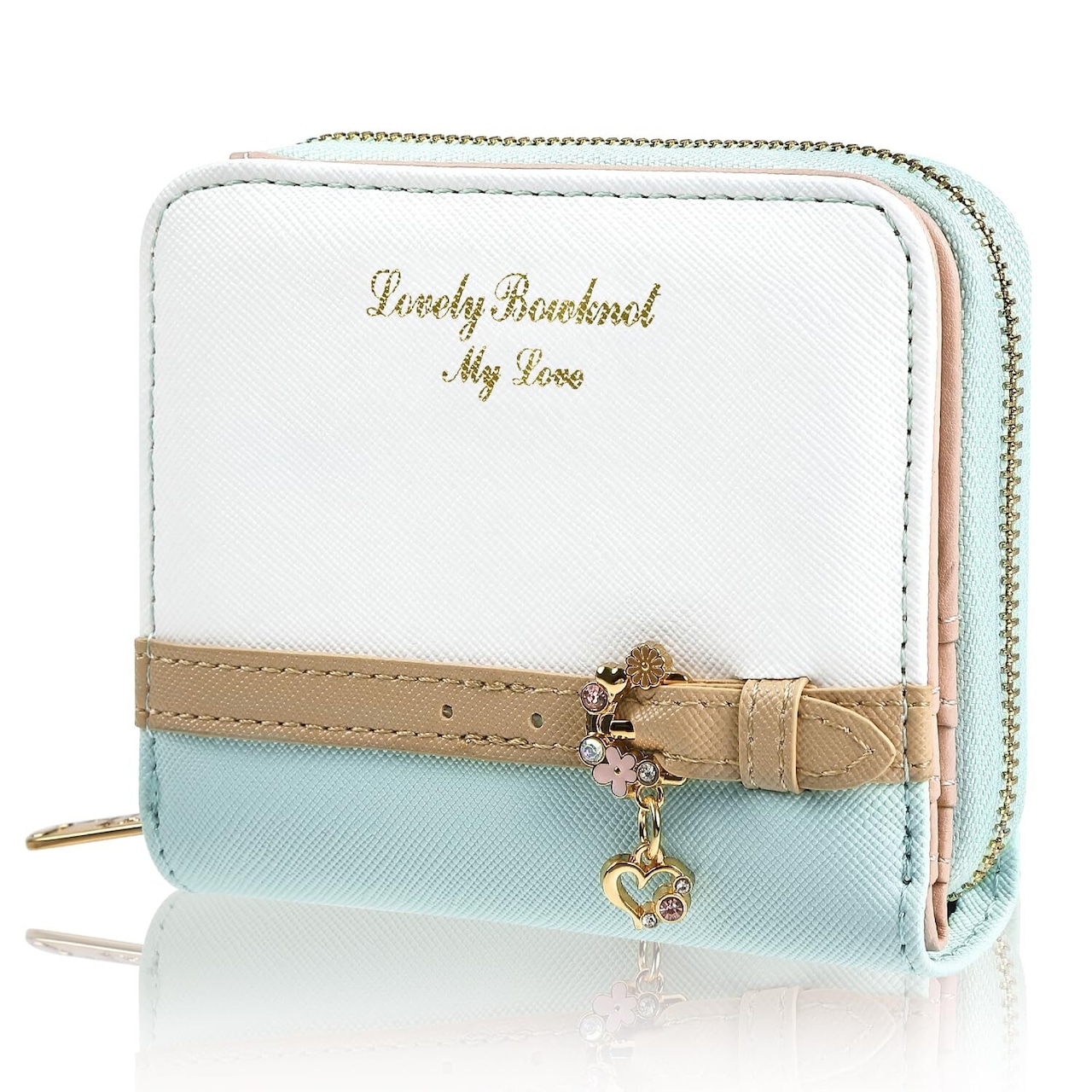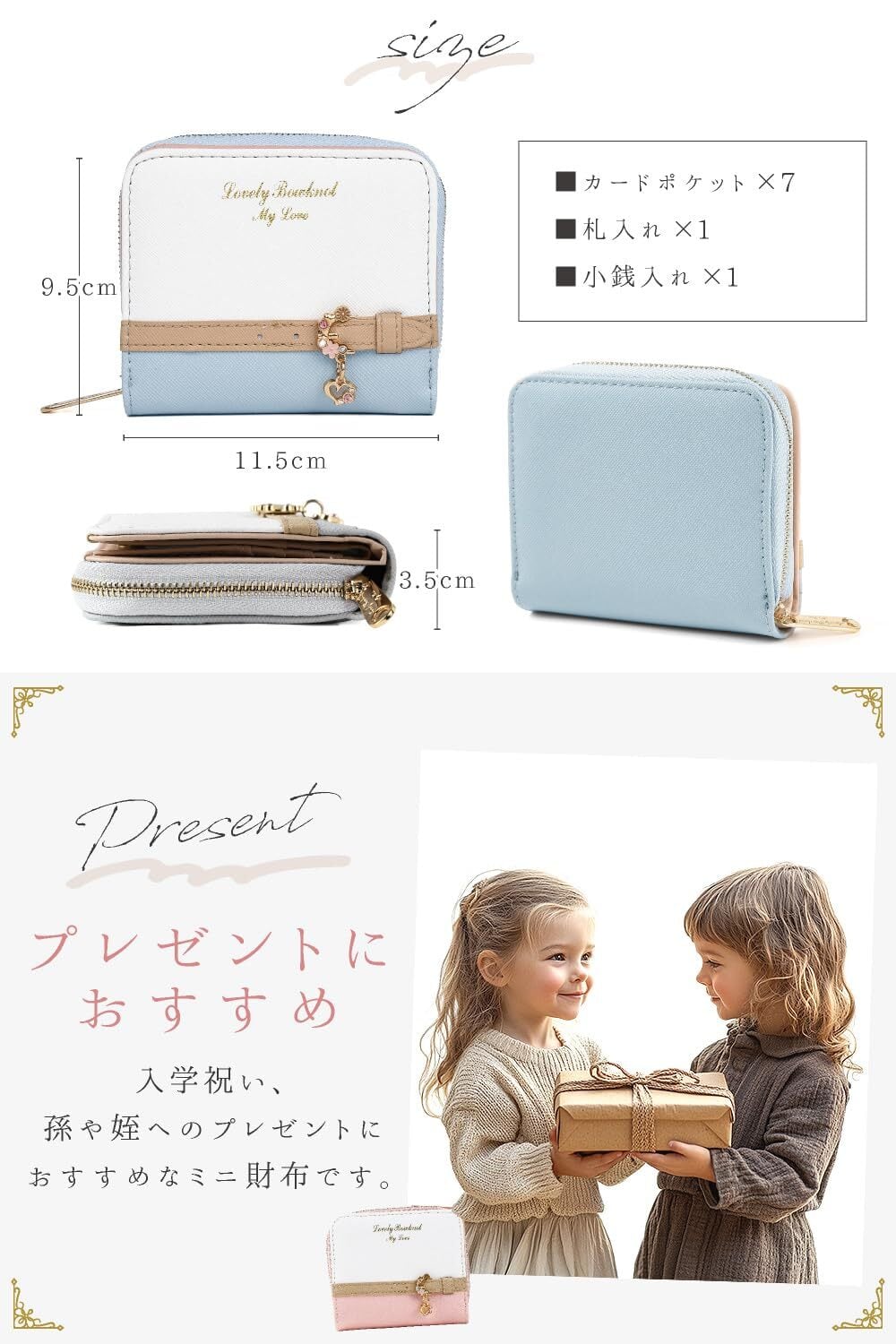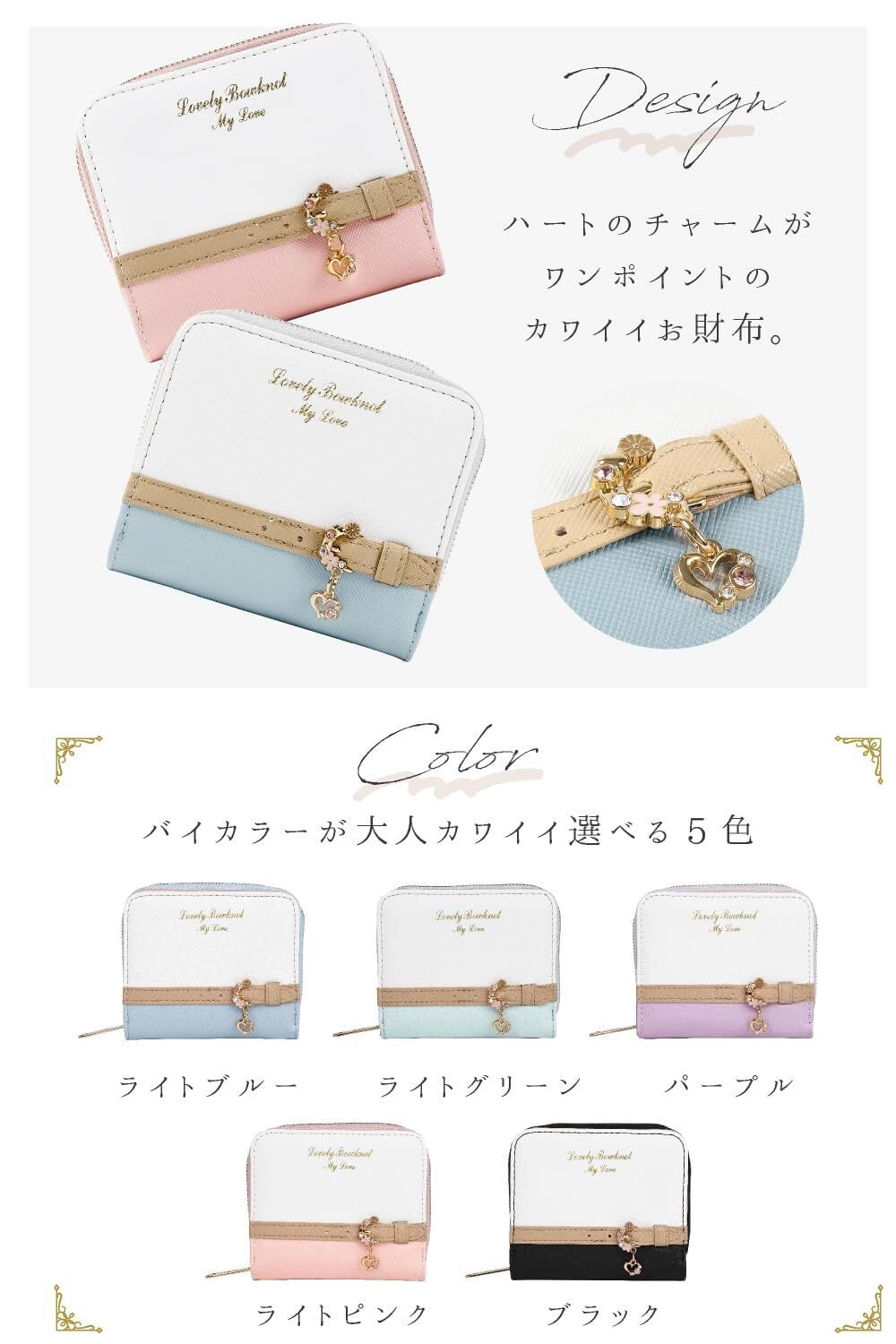小さなカバンには小さなお財布を 上質PUレザーミニウォレット シンプルに使いやすい二つ折り財布 パステルカラーが可愛らしさを引き立てます。 1.ゴールドアクセント 美しく光り輝くゴールドカラーがアクセント&高級感をプラス 2.ハートのワンポイント ハートのワンポイントアクセサリーで可愛さを 3.上質なPUレザー 上質なPUレザーを使用。丈夫で使いやすい。 4.実用性抜群! 小銭入れ、カード入れ、窓付きカード入れもあって使いやすい設計です。