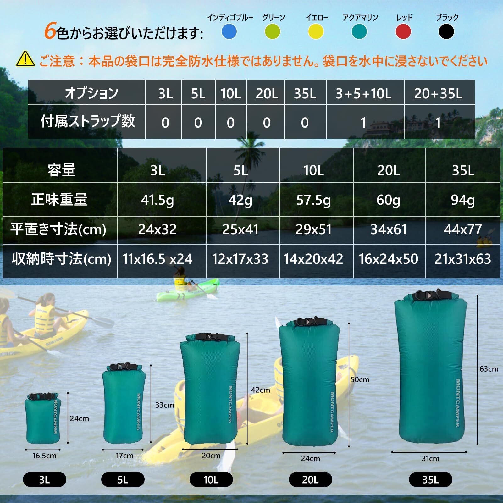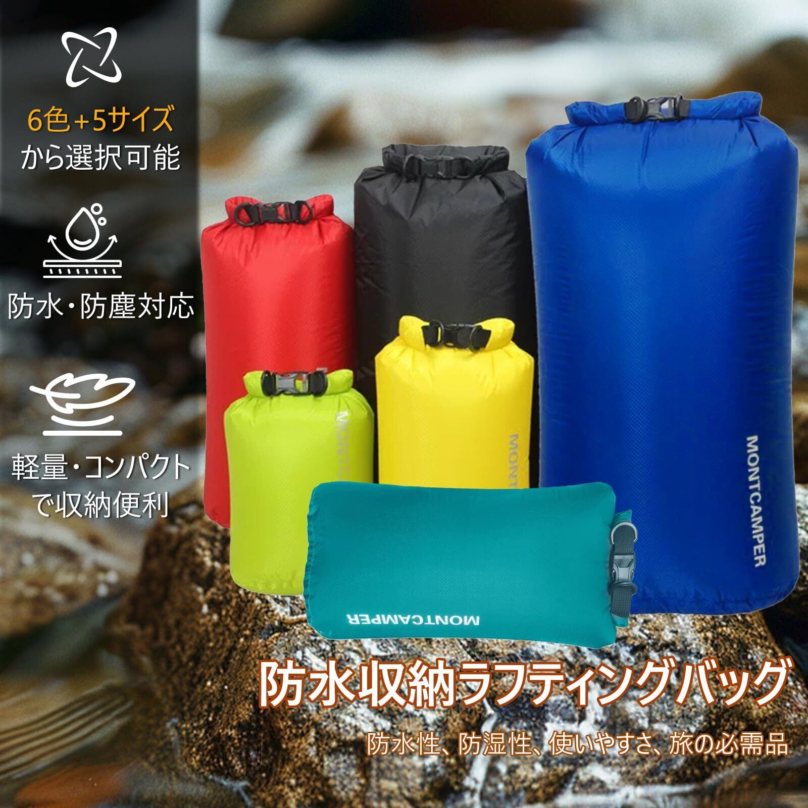 【豊富なサイズ&カラー|シーンに合わせて選択可能】3L/5L/10L/20L/35Lのマルチサイズと、6色のカラーバリエーション(イエロー・グリーン・インディゴブルー・ブラック・レッド・アクアマリン)を展開。日常使いから本格アウトドアまで、あらゆるニーズに対応。※光の加減やディスプレイ設定により、実物と色味が異なる場合があります。