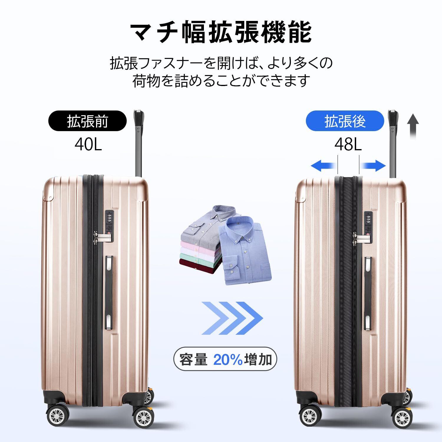 【20%容量拡張&高品質コーナーパッド】スーツケースの拡張機能を利用すれば、マチ幅が5cmほど拡張し、約20%内容量を増加。ABS樹脂とPC混合素材のボディーはただのABS素材より軽量で耐圧性、耐久性に優れています。コーナーパッド付きで、耐衝撃性も抜群です。
