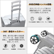 【耐衝撃材・盗難防止性】①スーツケースケースは高級ABS+PC材、強靭性を強化した三層複合耐圧性板材にアルミニウム合金フレームを採用し、丈夫で耐久性のあるケースを構成している。縁部の4つの角はアルミニウム合金の角で保護され、7つのリベットで強固に固定されている。また、箱体を用いて糸引き技術を用いて加工し、耐擦耐摩耗性の特徴がある。②アルミ合金フレームタイプのスーツケースは防水性、汚れ防止に優れています。また、アルミニウム合金フレーム構成の開閉方式は、安全・盗難防止の面でより優れている。