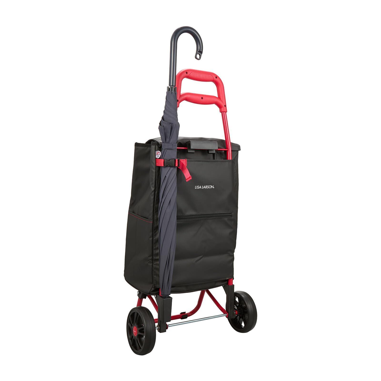 折り畳めてコンパクトに収納できるショッピングカート。保冷機能付きなのでお買い物に便利。お店のカートに取り付けられるフックや収納ポケット多数、傘立てなど機能充実。