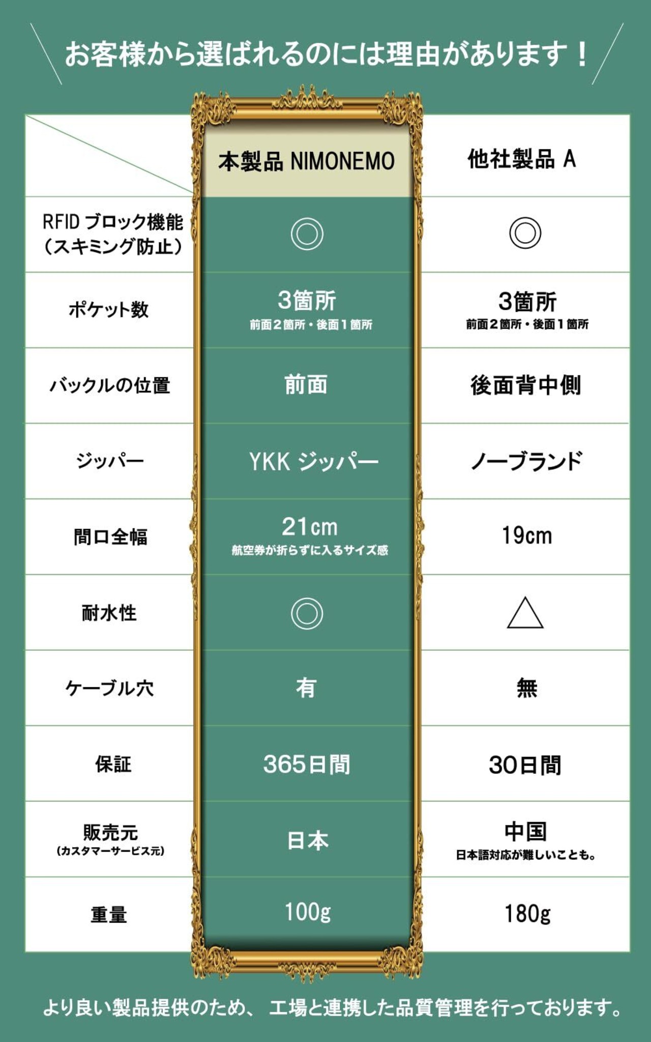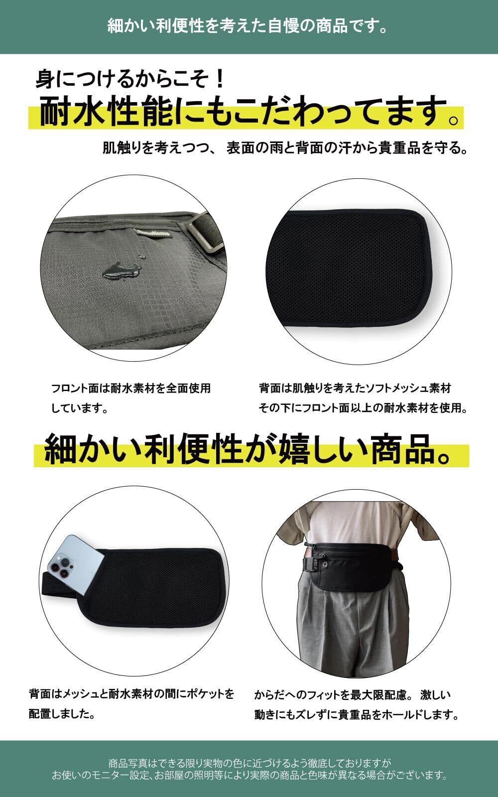 【スキミング防止と汗対策&使用感の追求】 スキミング防止機能はもちろん搭載しております。しかし、そもそも存在を悟られないのが原則なので、長時間身につけること踏まえた上で、特に使用感にこだわりました。正面に来ている使いやすいバックル、肌触りのよいスポンジメッシュを当てたお腹側、体に優しくフィットするラバーベルト、そして実は一番の大敵である、体から出る汗への影響対策。中身を濡らさないようにできうる限りの加工を施しました。使用するジッパーは信頼のYKK製。いざという時に、開かない、閉じないということがないように、コストをかけさせていただきました。