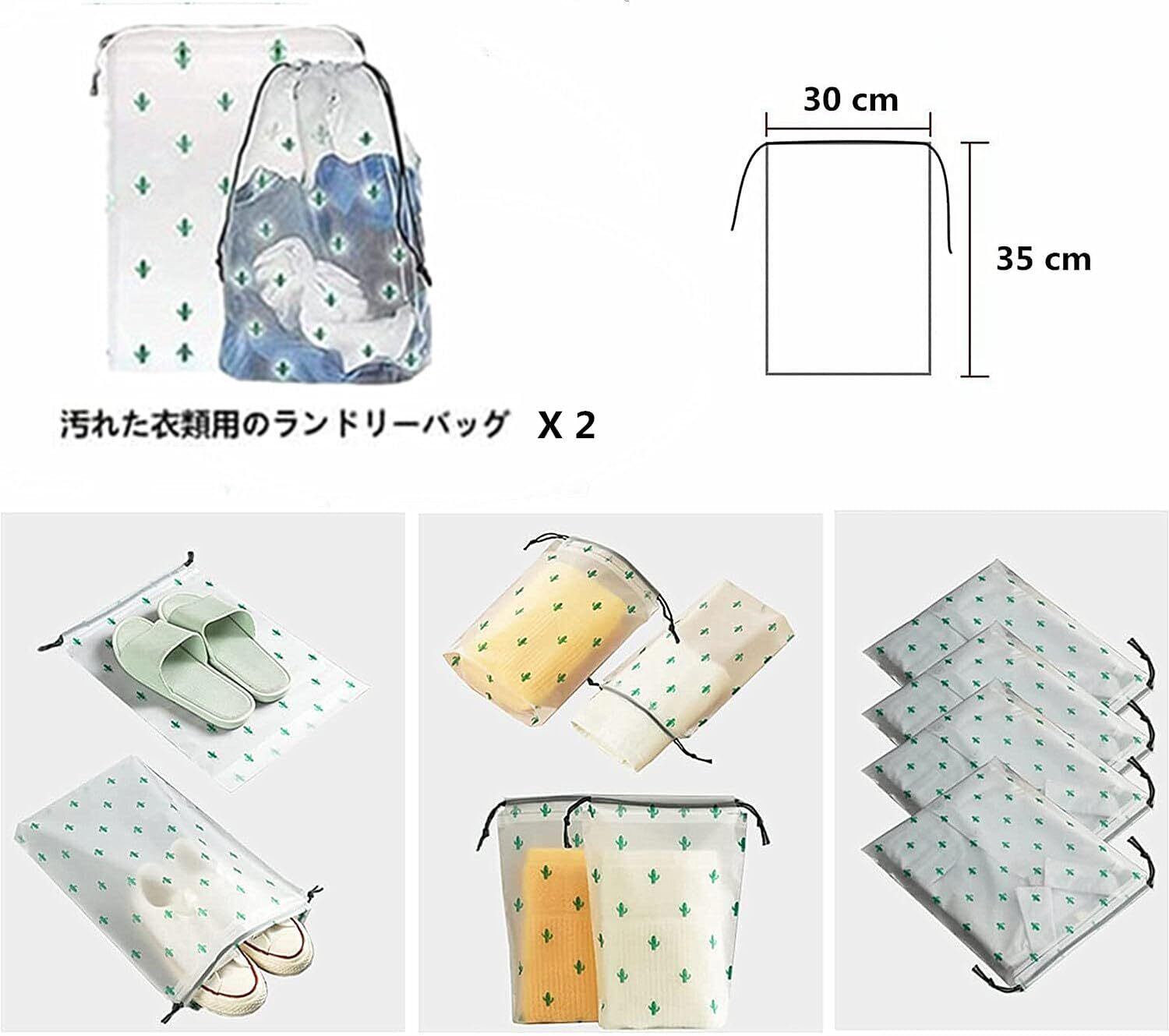 【セット内容】衣類圧縮収納ポーチ×2(M/L)、非圧縮汚れた服収納袋×1、下着用ポーチ×1、靴下の収納袋×1、シューズバッグ×1、掛け式化粧ポーチ×1、汚れた衣類用のランドリーバッグ×2。