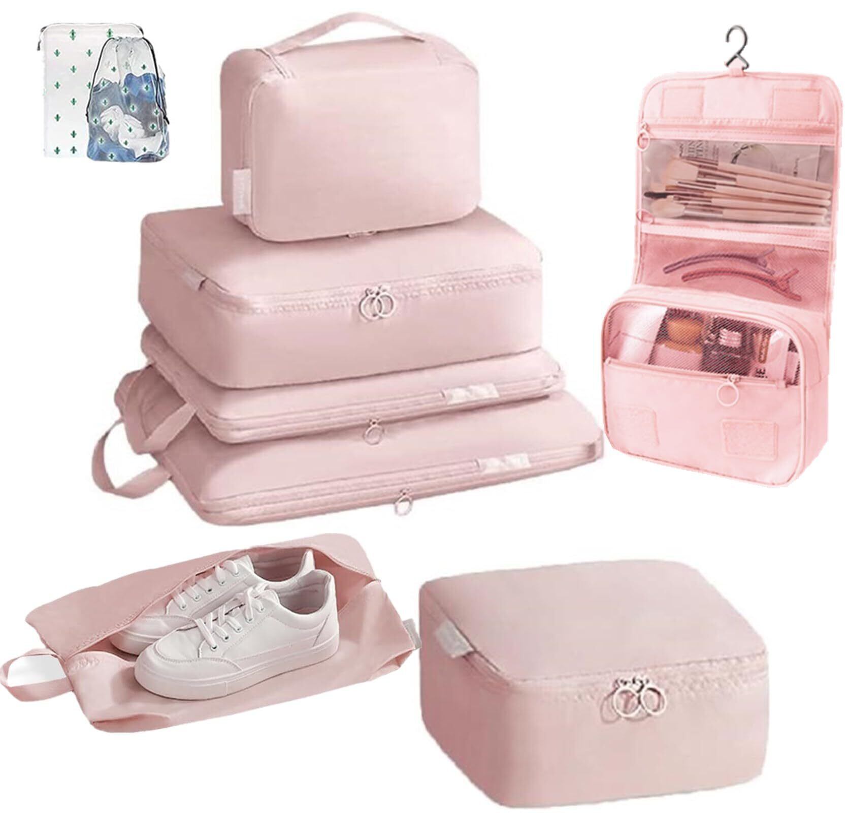 トラベルポーチ 圧縮 9点セット 旅行用ポーチ スペース節約50% 【2025新設計】旅行用圧縮袋 便利旅行圧縮バッグ パッキングポーチ 洗面用具 旅行用 撥水加工 衣類仕分け 温泉 出張 海外 修学旅行 靴用 下着収納(ピンク)