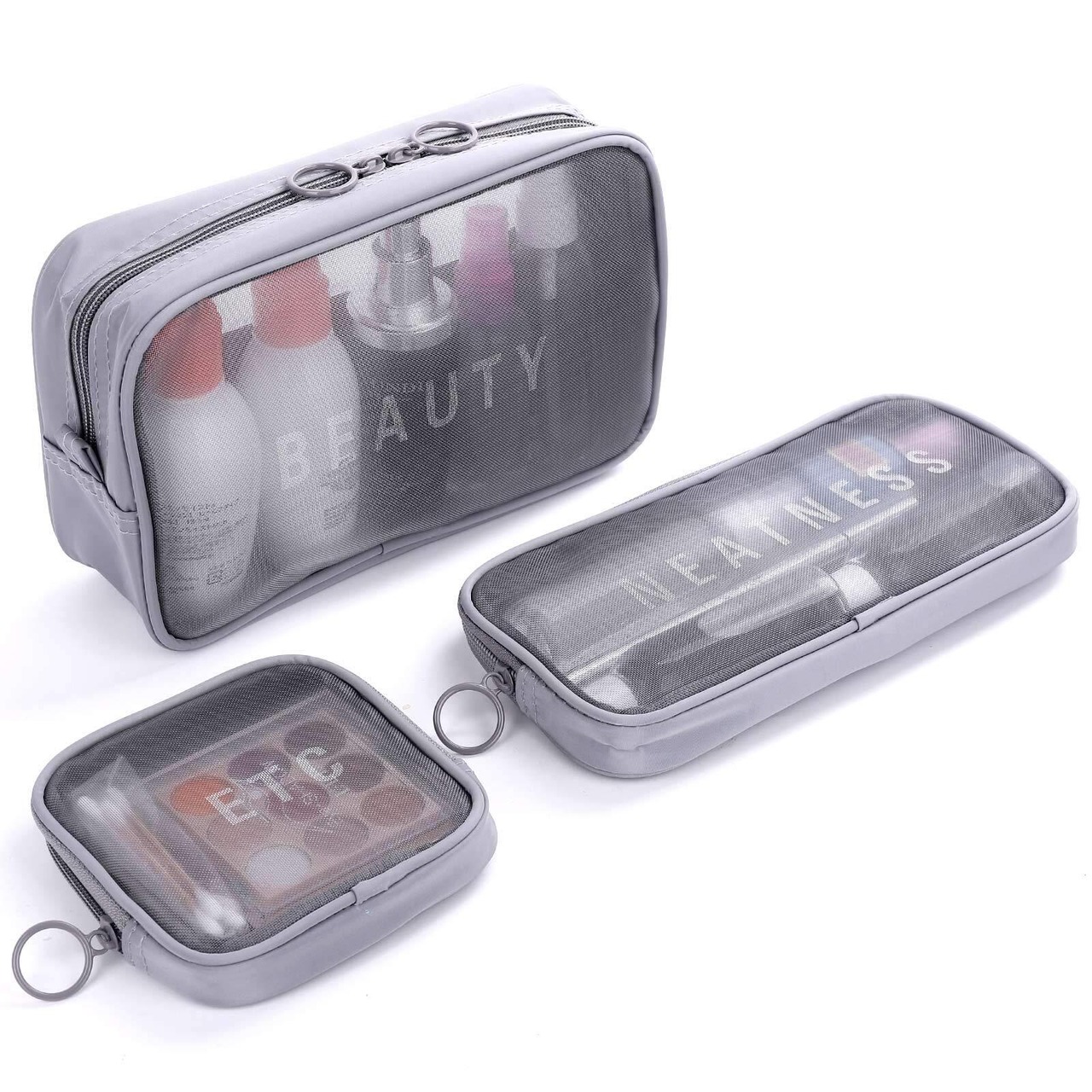 【在庫セール】トイレタリーバッグ コスメポーチ トラベルポーチ 旅行用化粧ポーチ 洗面用具ポーチ 多機能 旅行用品収納バッグ 防水 透明メッシュ 大容量 化粧品入れ 小物整理 軽量 3点セット(グレー) | SmartLiving+
