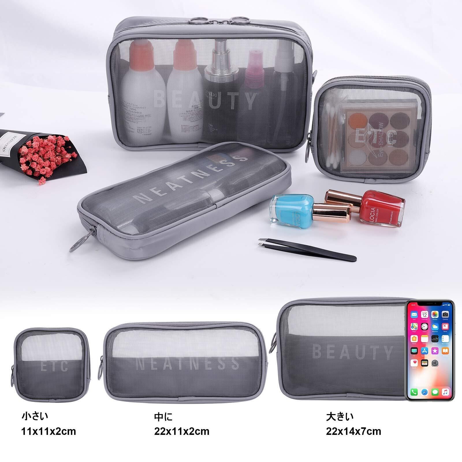 トイレタリーバッグ コスメポーチ トラベルポーチ 旅行用化粧ポーチ 洗面用具ポーチ 多機能 旅行用品収納バッグ 防水 透明メッシュ 大容量 化粧品入れ 小物整理 軽量 3点セット(グレー)