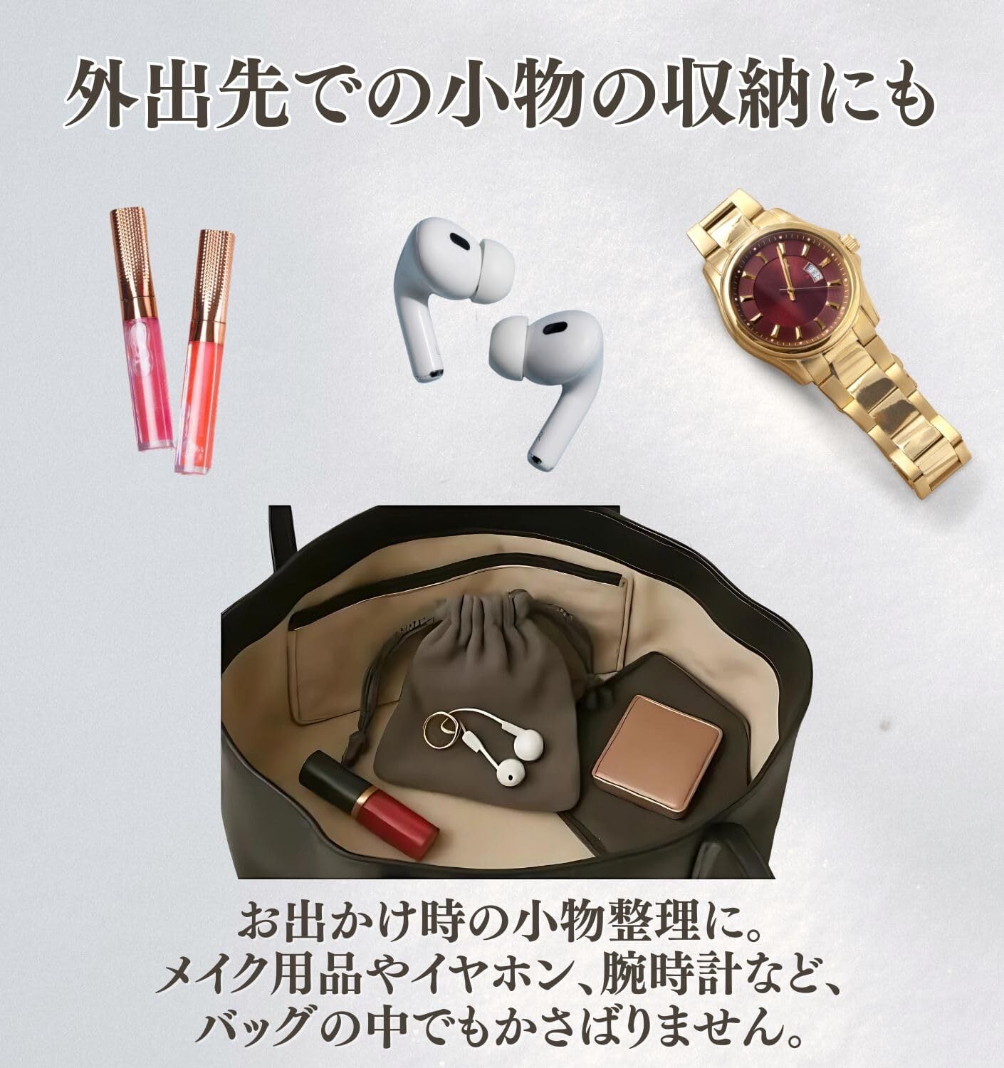 【ジュエリーを優しく包む柔らかな質感】ジュエリーやアクセサリーを優しく収納できる、肌触りの良い柔らかな素材で作られたミニ巾着袋です。手に取るたびに感じる心地よさが魅力の高級感あるポーチ。ブラックとグレーの2色展開で、シンプルながらも上品な印象を与えます。