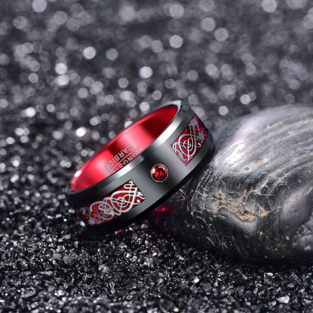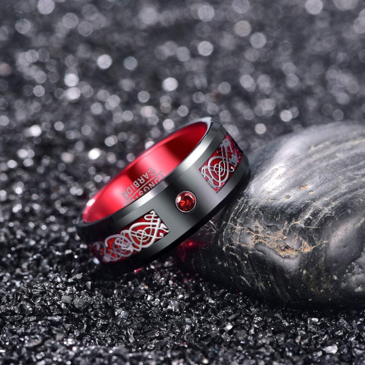 083基地 メンズ 指輪 リング タングステン ドラゴン 竜紋 炭素繊維 キュービックジルコニア 横幅8mm 平打ち レッド 真空メッキ 14号