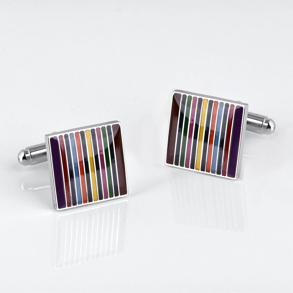 【カラフルなストライプデザイン】多色のストライプが施された四角形カフスボタンは、個性的で目を引くデザインが魅力です。ビジネスシーンやフォーマルな場面での使用に最適です。
