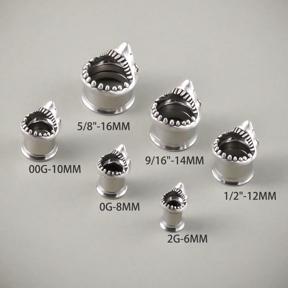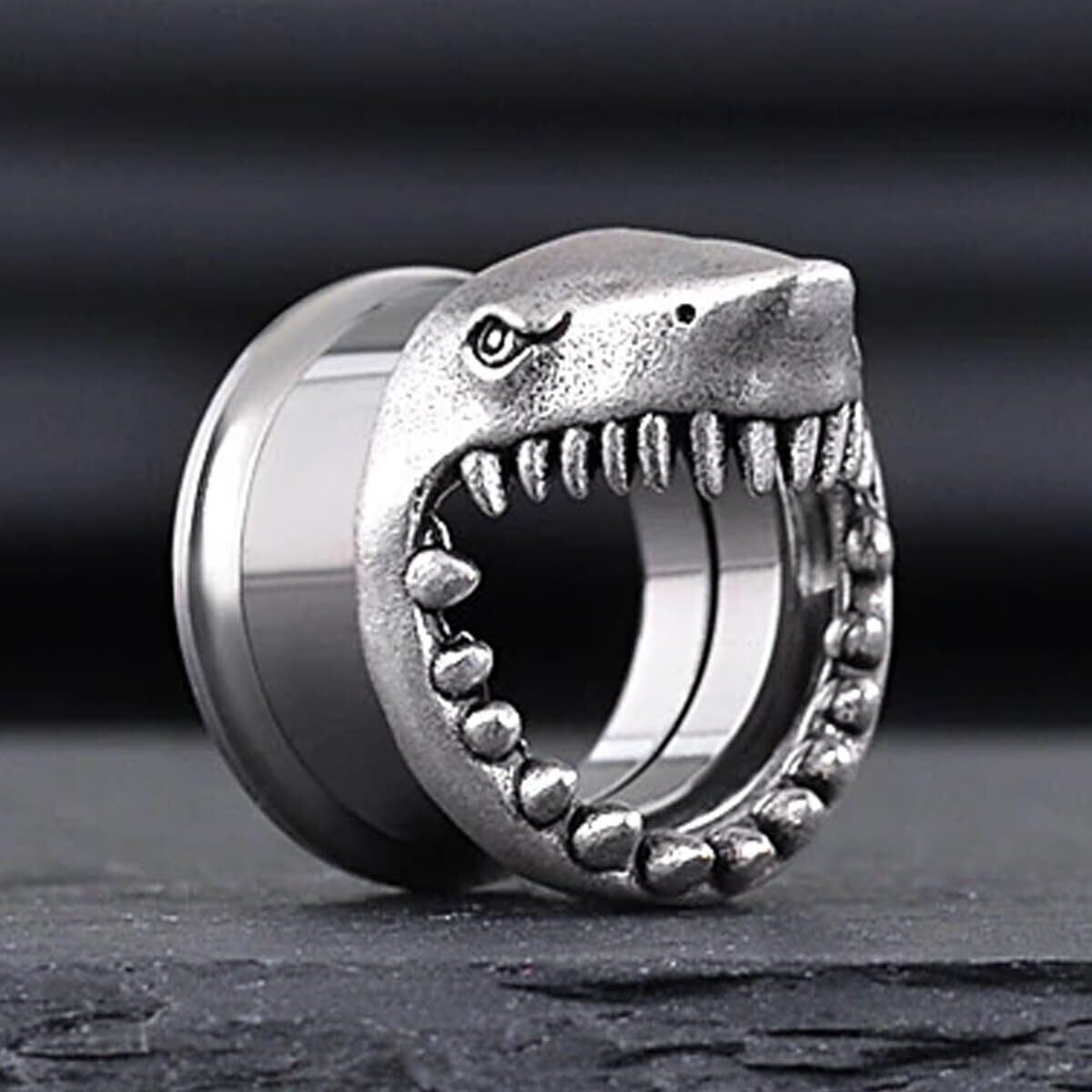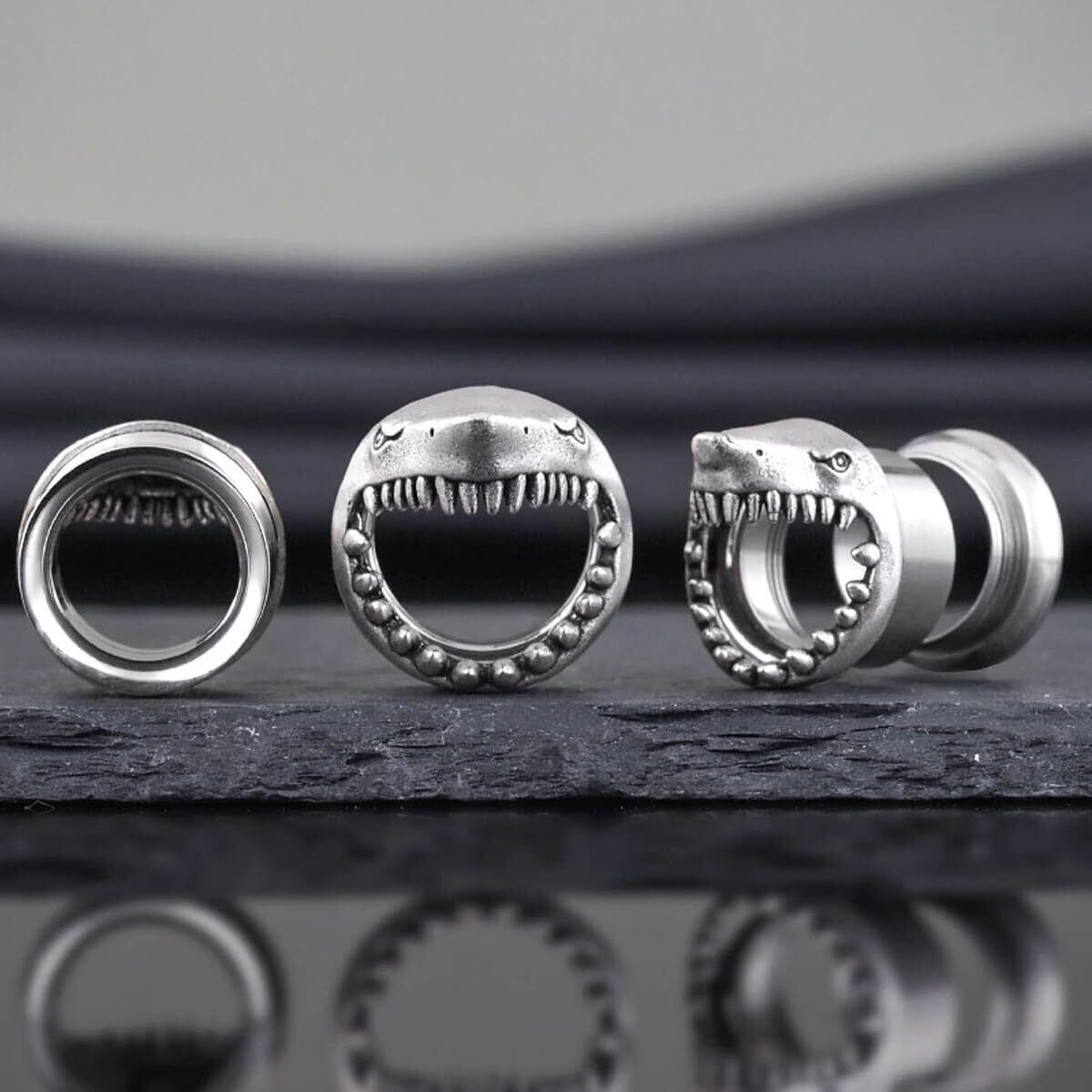 大きな口を開けたサメのキバが不気味に光るネジタイプのダブルフレア型ボディーピアス。 今にも噛みつきそうな鮫の牙が存在感をアピールしてくれるホール系ボディピアス。マットな鮫の光りすぎない銀色シルバーがかっこよく男性からも女性からも人気のボディピアス。 螺子タイプなので拡張器やインサーションテーパーがなくてもサイズが合えば装着できるので、両側が広がったダブルフレヤ型でも安心して購入できる。 ユニークで面白いモチーフのネジ式のボディピアスは、ハロウィーンパーティーの仮装コスプレやお化け屋敷のスタッフにもオススメの不気味なボディピアス。 メンズでもレディースでも使えるので、ペアルックやプレゼントにも!ダブルフレアの素材はステンレス素材なので安心。