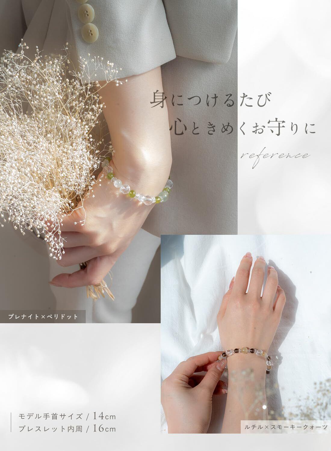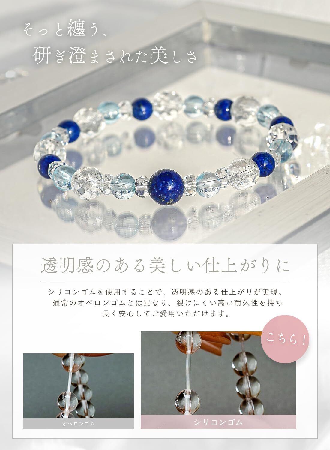 日常生活でブレスレットが避けたり、切れてしまう心配がないように、丈夫な高品質シリコンゴムを使用しています。伸縮性があり、着脱もスムーズで快適なつけ心地を実現。 さらに、シリコンゴムは透明なので、天然石の美しい色合いを引き立て、上品な印象を演出します。 どんなシーンにも馴染みやすく、長くご愛用いただける仕様となっています。