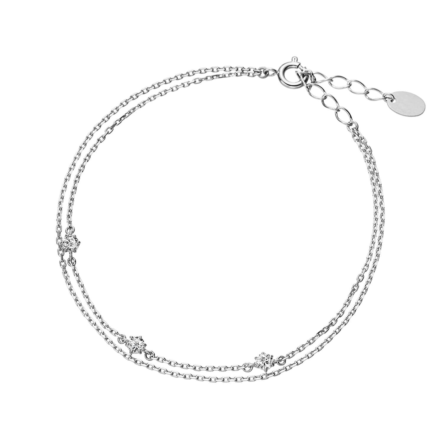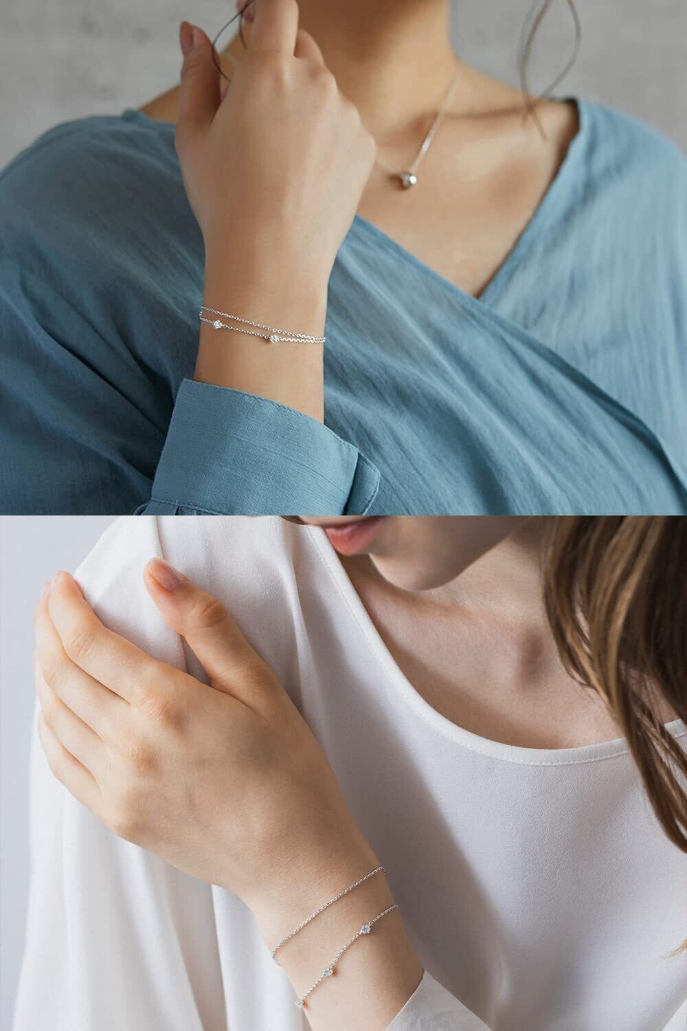 【上品な印象に】キュービックジルコニアが華やかさを添える、爽やかで上品な印象のブレスレット。ほどよいボリュームの2連のチェーンが女性らしい華奢な手元に。