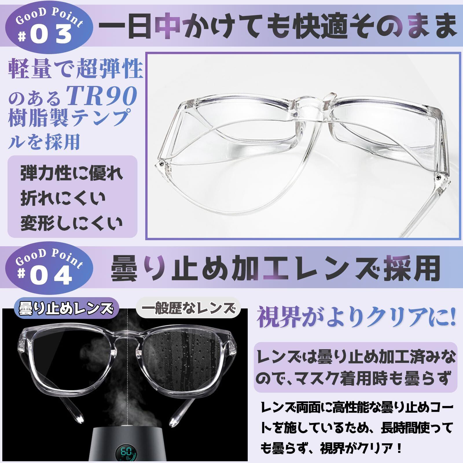 【多機能レンズ】新開発の高性能レンズを採用し、35%のブルーライトカット、99%のUVカット、さらに防曇機能を備えています。スマートフォンやタブレットからのブルーライトを効果的に遮断し、日常の紫外線から目を保護。透明レンズには高性能な防曇コーティングが施され、長時間使用しても曇ることがありません。作業や日常生活がさらに快適になります。