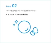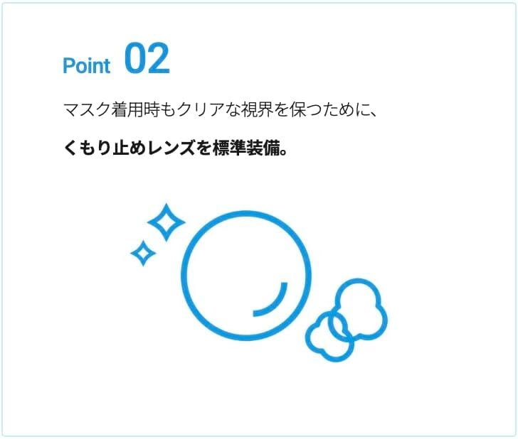 レンズは、マスクをしても曇りにくい防曇レンズを採用(※別売り「くもりどめスプレー」との併用はお避けください)。
