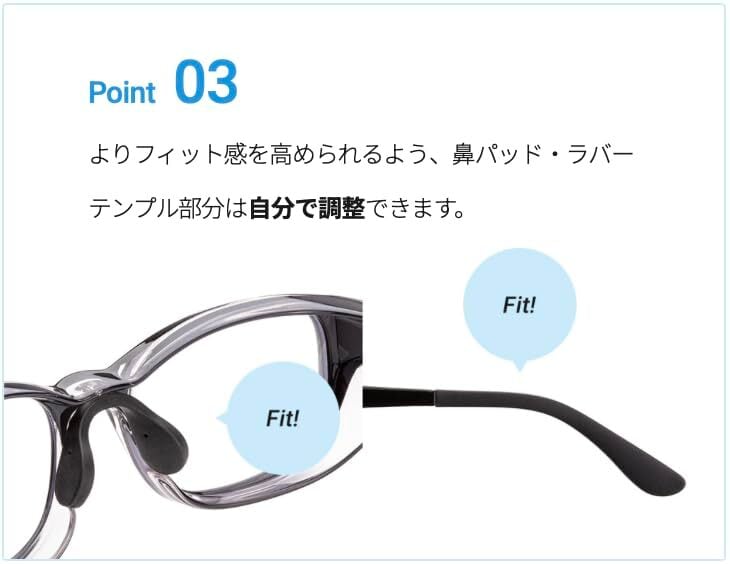 不快な曇りが出にくい防曇レンズ標準装備。目元の隙間を少なくしたデザインで外からの花粉や粉塵の侵入を低減。