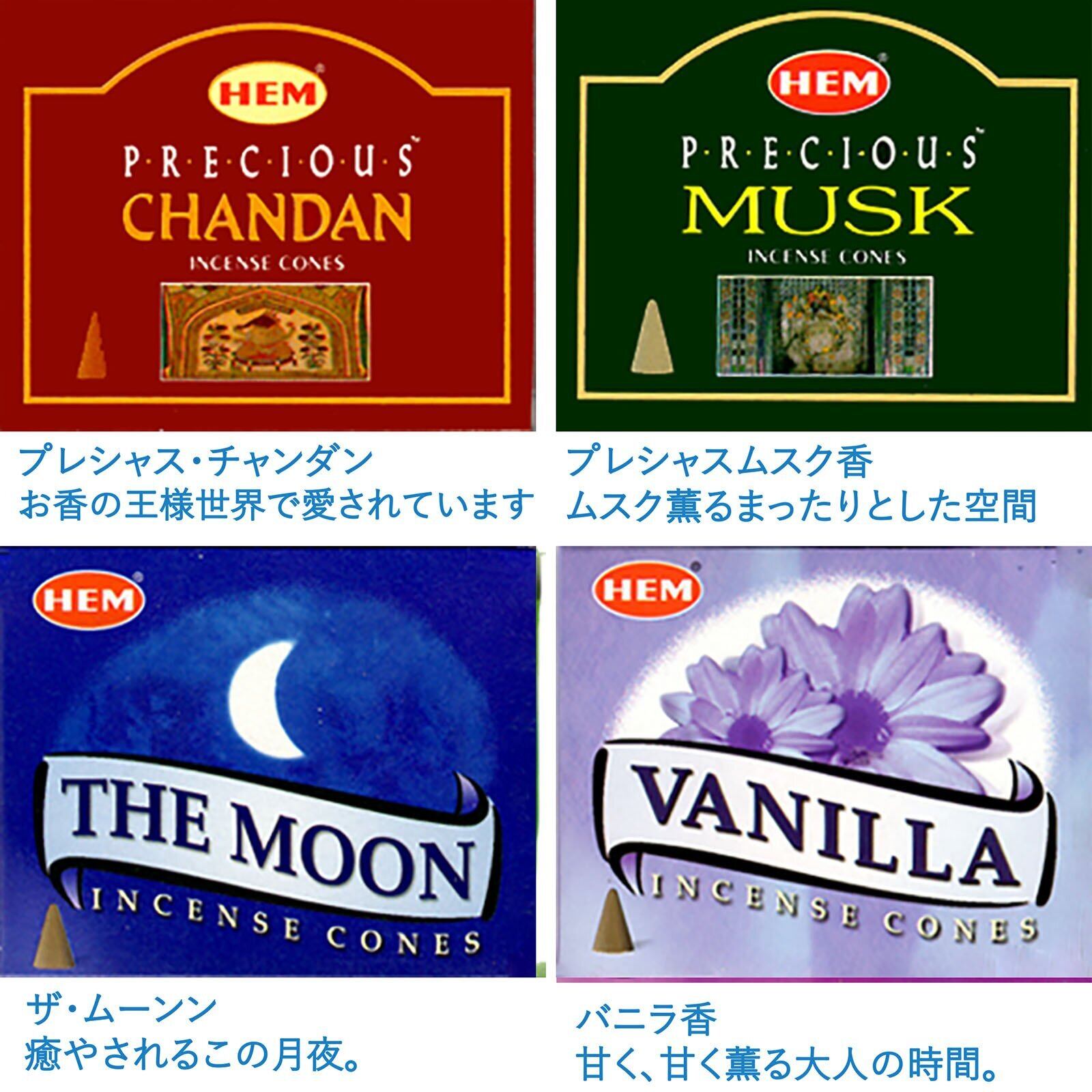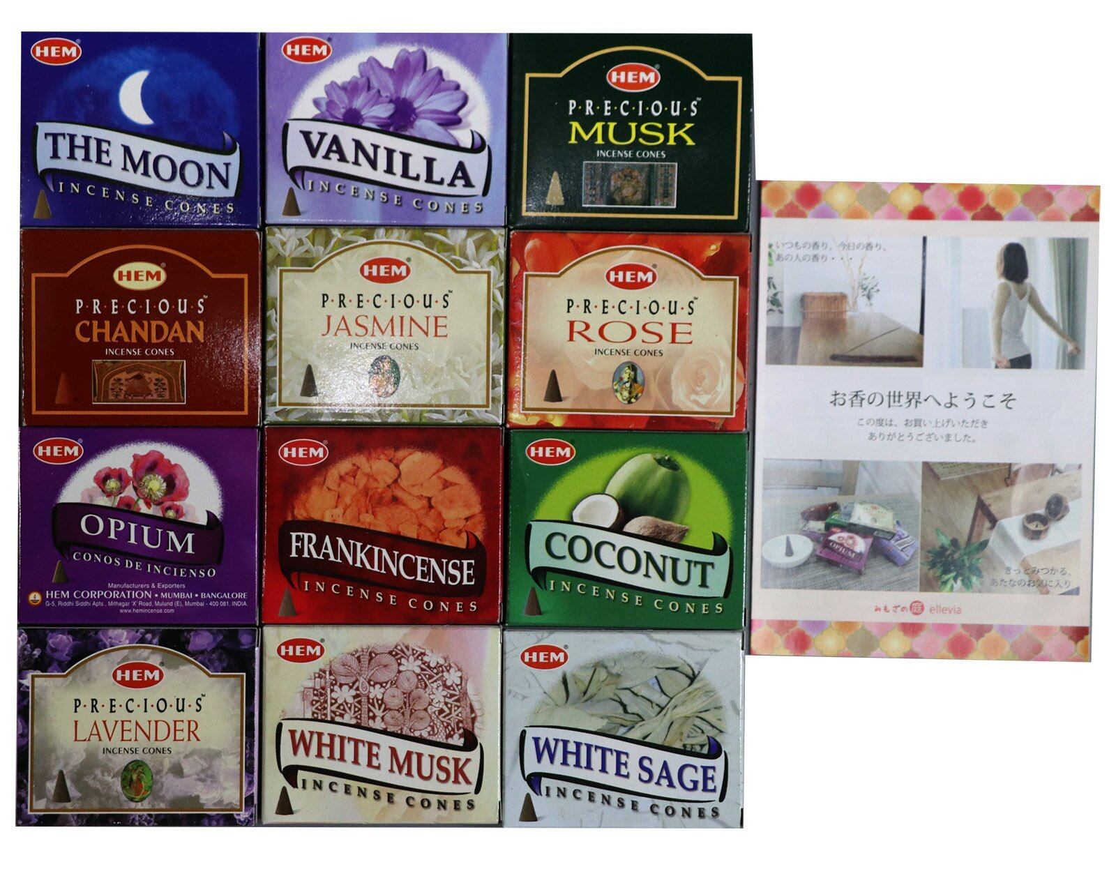 HEM社 インド製 コーンタイプ香 12種類の香り 合計12箱120個入(アソートセット) お香の世界へようこその小冊子付き
