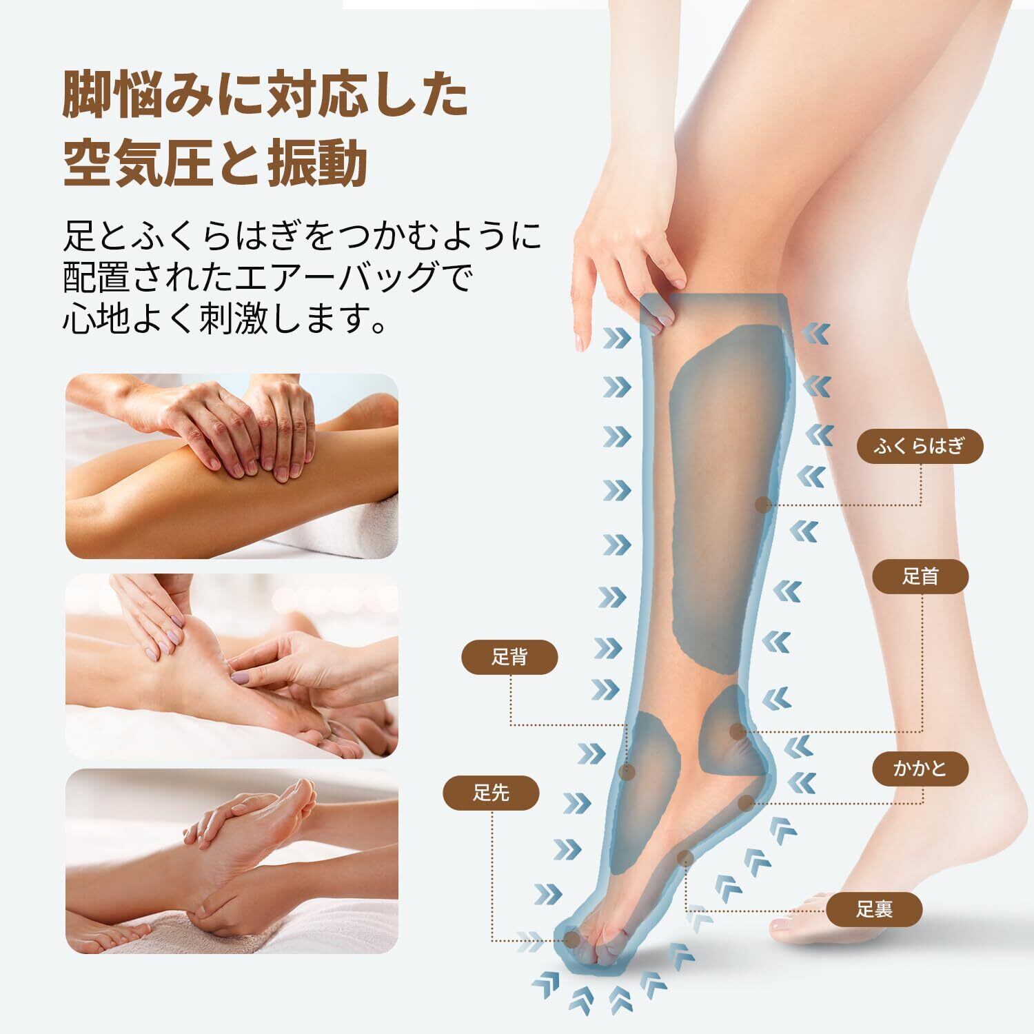 【360°余すところなく包み込む】足とふくらはぎをつかむようにエアーバッグを配置!脚をエアーで全周ギュッと包み込みながら、寝る前の心地よさを追求しました。