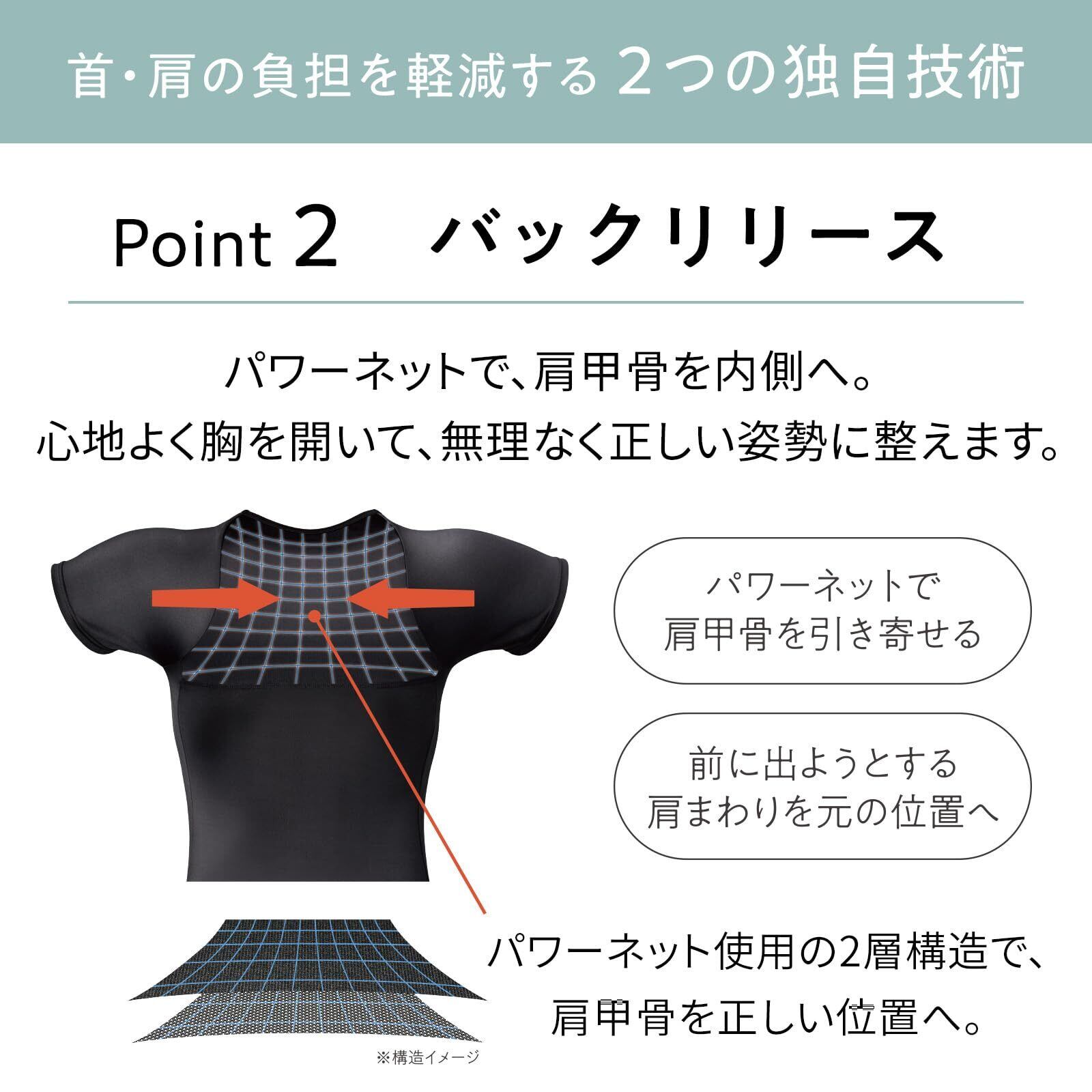 【無理のない正しい姿勢を叶える二つのテクノロジー】(バックリリース)後ろ身ごろ上部に配置されたパワーネットで肩甲骨を内側へ。 心地よく胸を開いて姿勢を整えます。