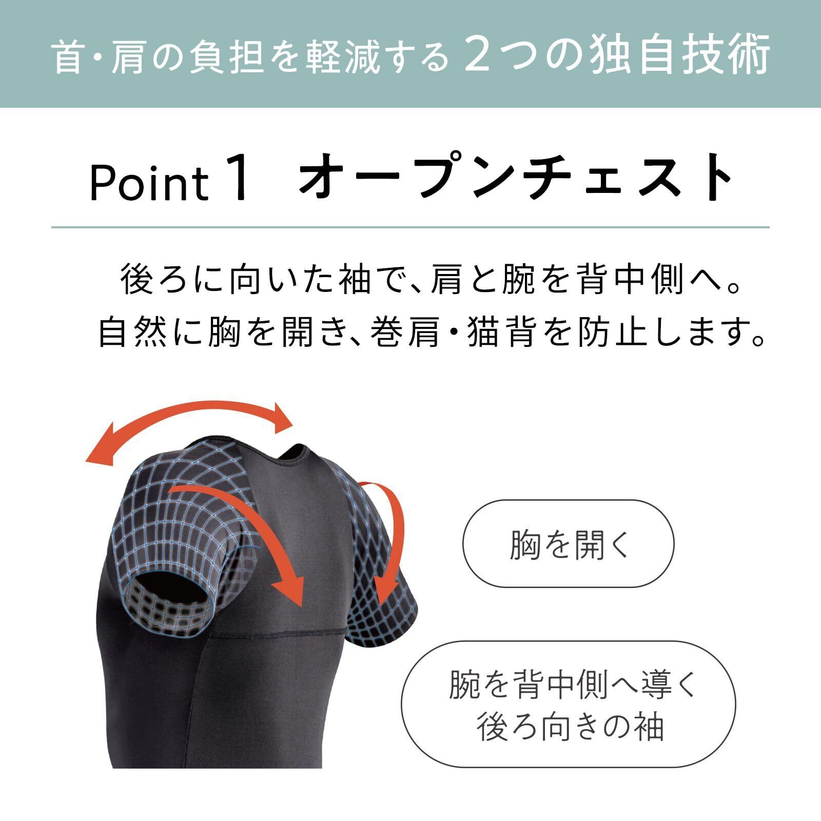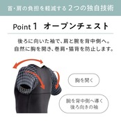 【無理のない正しい姿勢を叶える二つのテクノロジー】(オープンチェスト)少し背中側に向いた袖が肩と腕を背中側に。 自然と胸が開き、巻肩・猫背を防止します。
