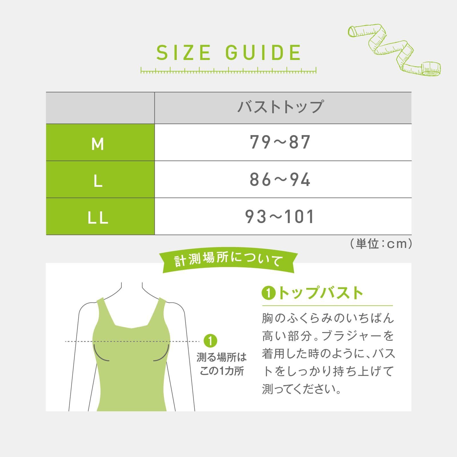 M・L・LLの3サイズ展開【SIZE:M バスト メーカー表示サイズ:79cm~87cm】【SIZE:L バスト メーカー表示サイズ:86cm~94cm】【SIZE:LL バスト メーカー表示サイズ:93cm~101cm】※胸の一番ふくらんでいるところ(=トップバスト)でサイズを選んでください。