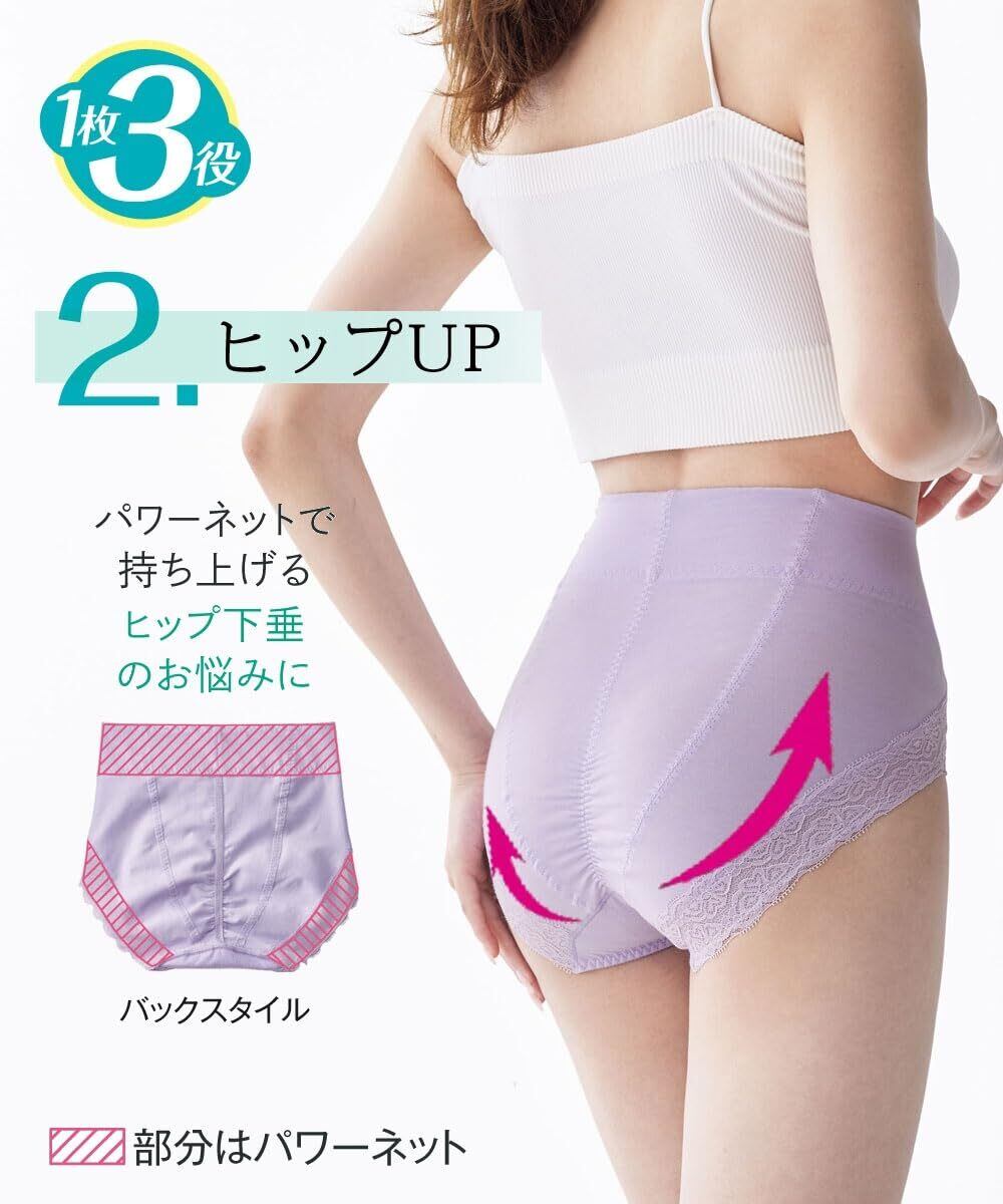 1枚で3役(お腹おさえ、ヒップアップサポート、ウエストらくちん)の機能があり、様々な悩みを解決します。
