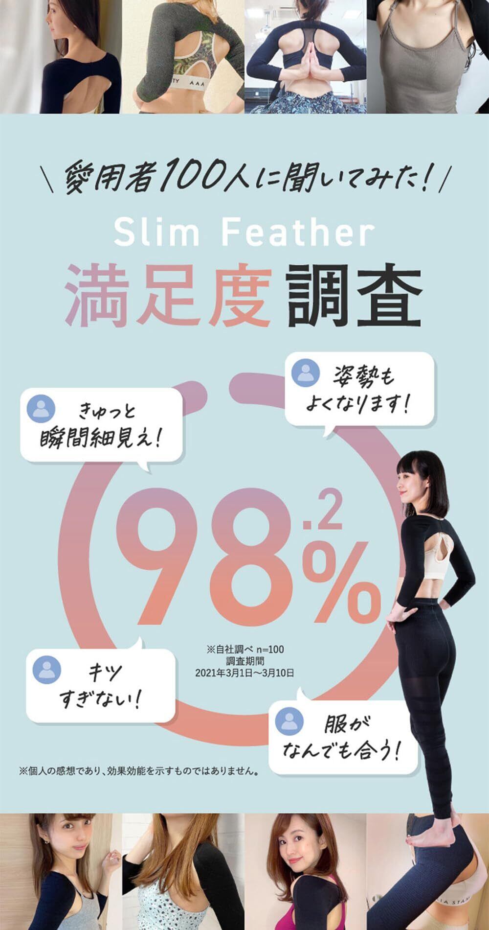 Slim Feather スリムフェザーは、「スリムな二の腕」と「美しい姿勢」をサポート! ぷるぷる二の腕や猫背、巻き肩などが気になる方にオススメの二の腕着圧インナーです。 まずはお試しでの単品購入、洗い替えにも便利な2枚セットからお選びいただけます。