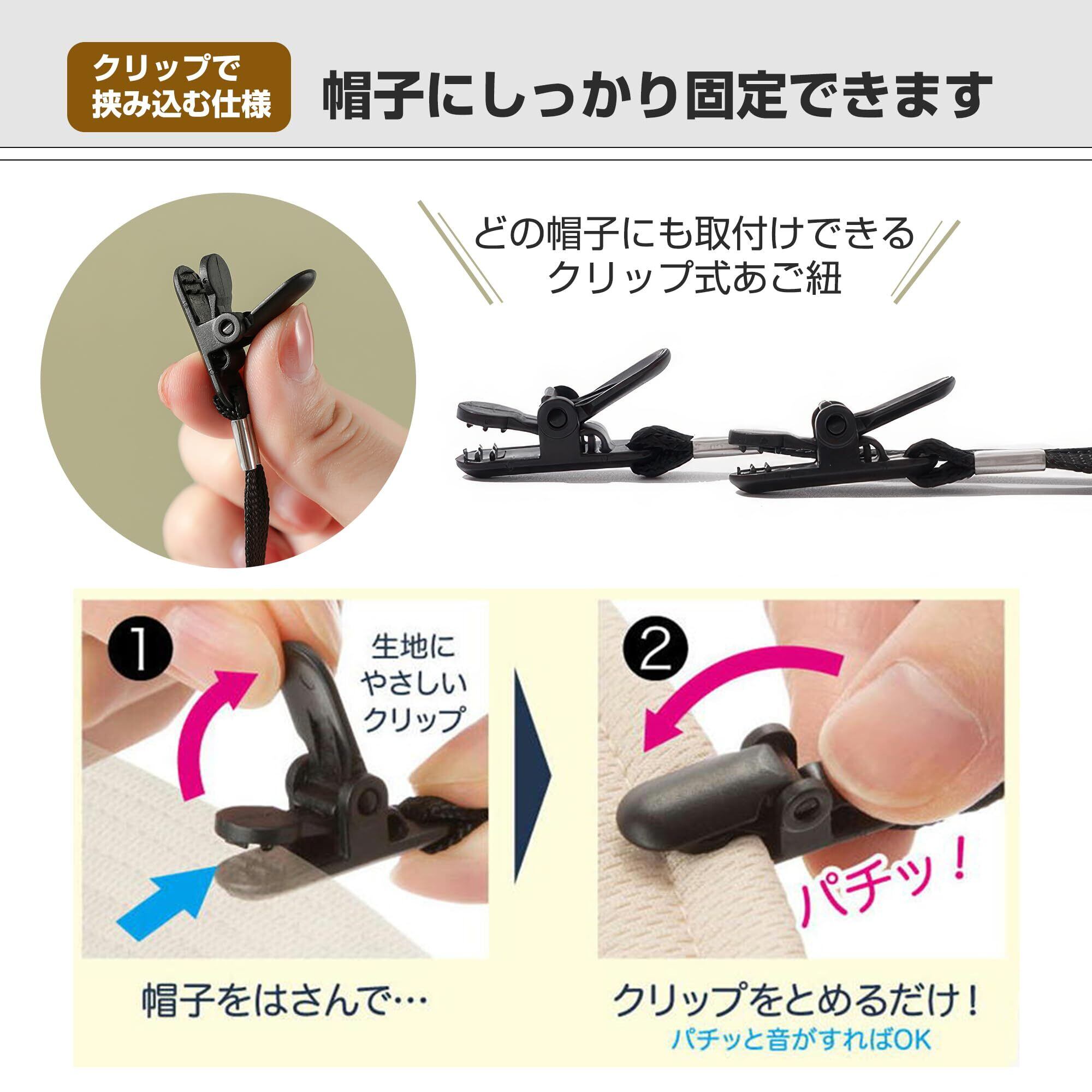 【クリップ式の帽子ストラップ】お得な同色2個セット!クリップで挟み込む仕様のため、ループの付いていないハットやキャップなど帽子の形状などに合わせて自由に取り付けることができます。パチッと音がすればクリップが閉じます。帽子にしっかりと固定できます。クリップは生地に優しい設計で、服や帽子に跡がつきにくくなっています。