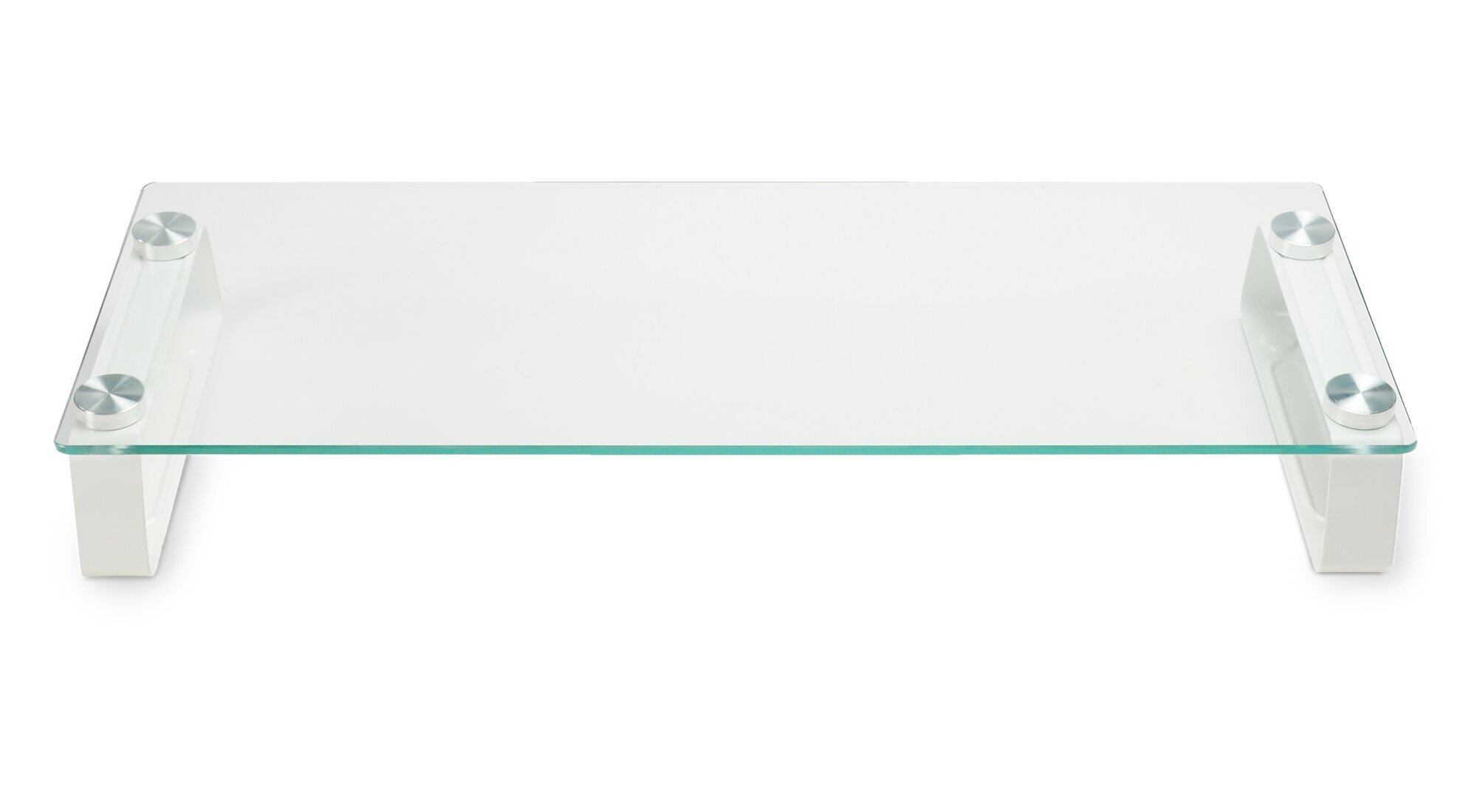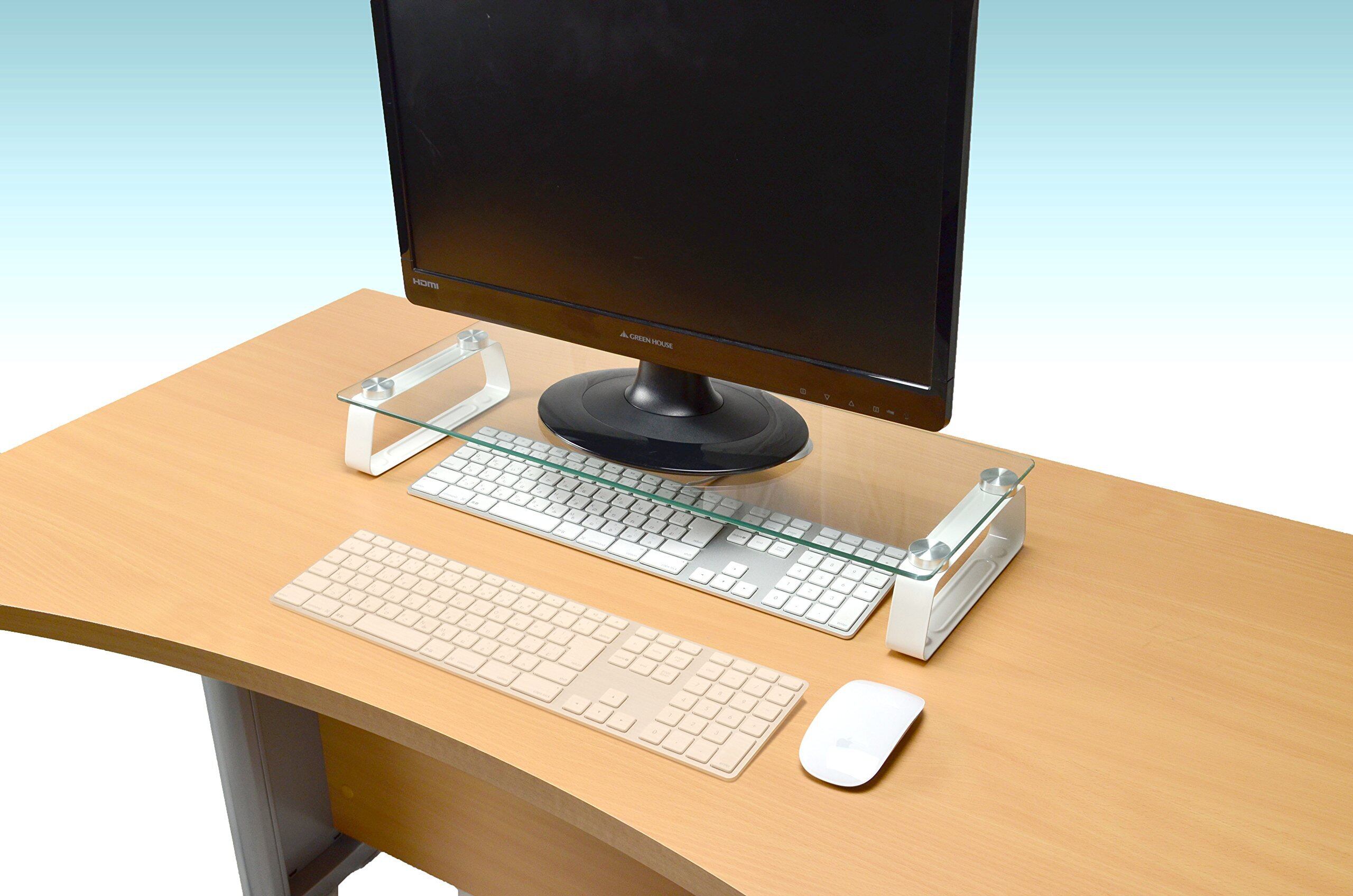 透明な強化ガラスの天板に白いアルミフレームのシンプルなデザインなので、どんなデスクにもマッチし、家庭での使用からビジネス用途まで幅広い場所で使用できます。