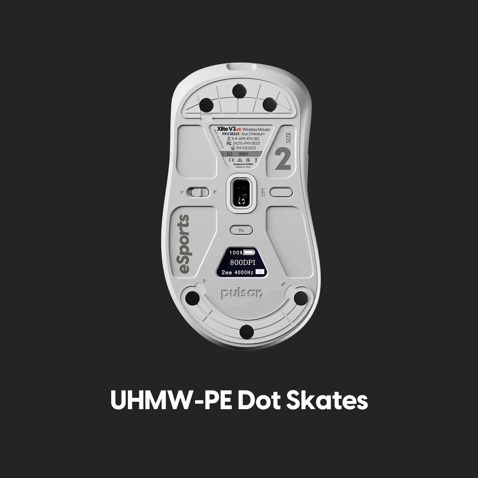 UHMW-PE Dot Skates - 合計16個のUHMW-PE製6.6mmマウスドットスケートが付属しています。マウスに取り付けて通常のマウスパッド上で使用すると、騒音が最小限に抑えられ、優れた耐摩耗性を発揮し、長時間の使用でもスムーズな操作が可能です。摩擦によるコントロールのレベルは、適用するドットの数によって調整できます。