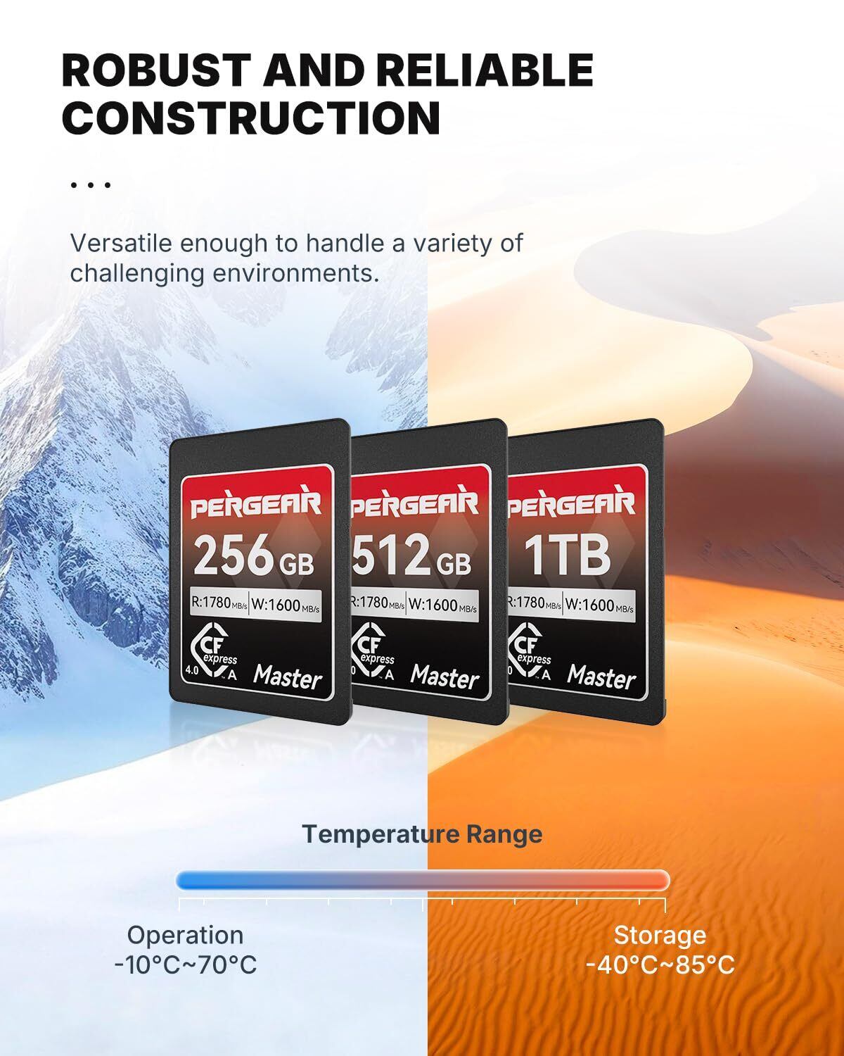 Pergear CFexpress 4.0 Type A メモリカードは、最新の USB4.0 インターフェイスを採用し、1780MB/秒の驚異的な読み取り速度と 1600MB/秒の書き込み速度を実現し、最も要求の厳しい 4K および 8K ビデオ録画や、高解像度の RAW 画像の連続撮影にも対応します。