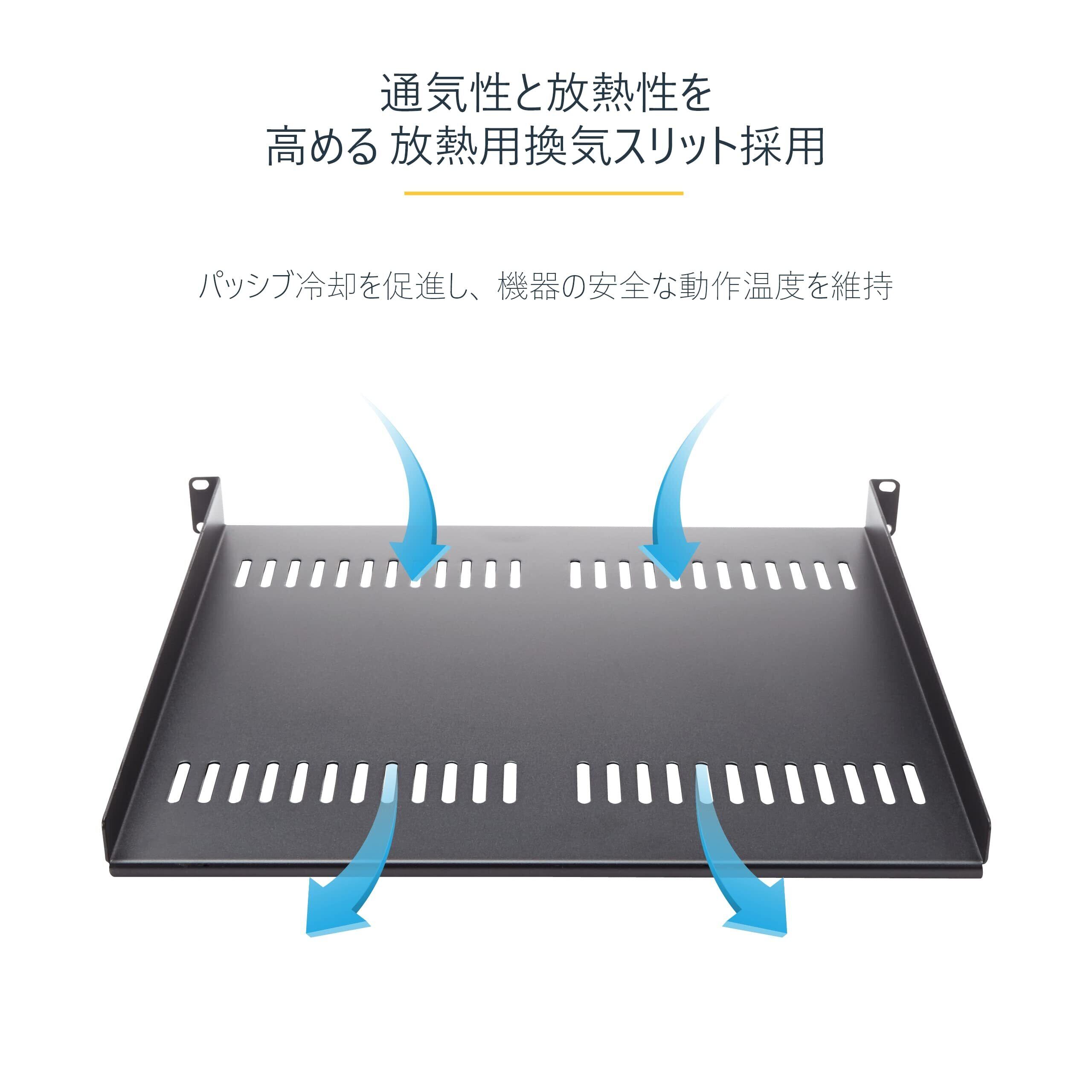 1Uラック棚板。EIA-310互換のサーバーラックまたはキャビネットに、奥行き254mm(10インチ)のストレージスペースを追加します。放熱スリット付き棚板は、通気性を改善しラック内の温度上昇を抑えます。