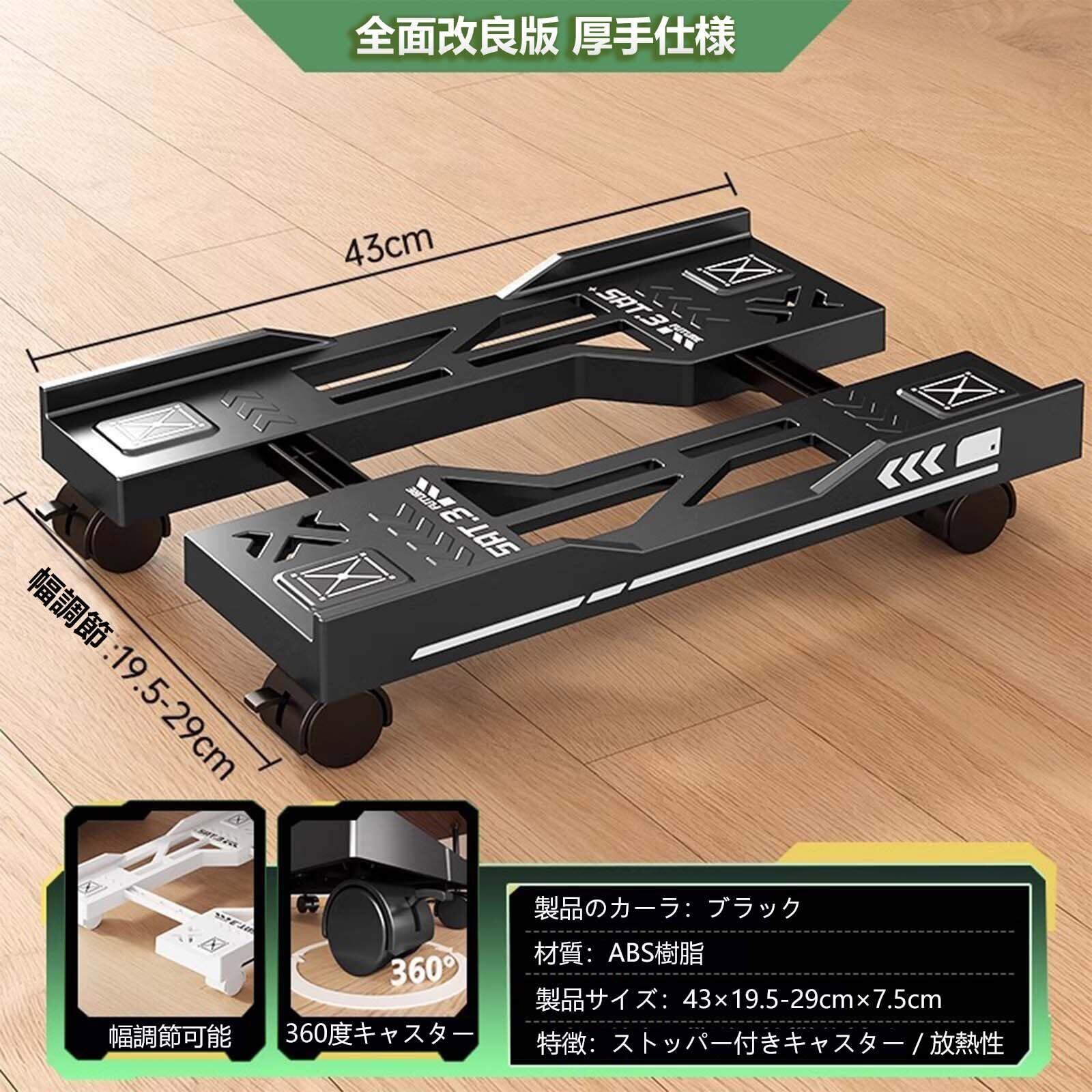 仕様:材質:ABS樹脂 耐荷重:80kg サイズ:幅43cm×奥行19.5~29cm(幅無段階調節可能) 付属品:キャスター×4(全方向回転/ストッパー付き) 重量:約0.8kg