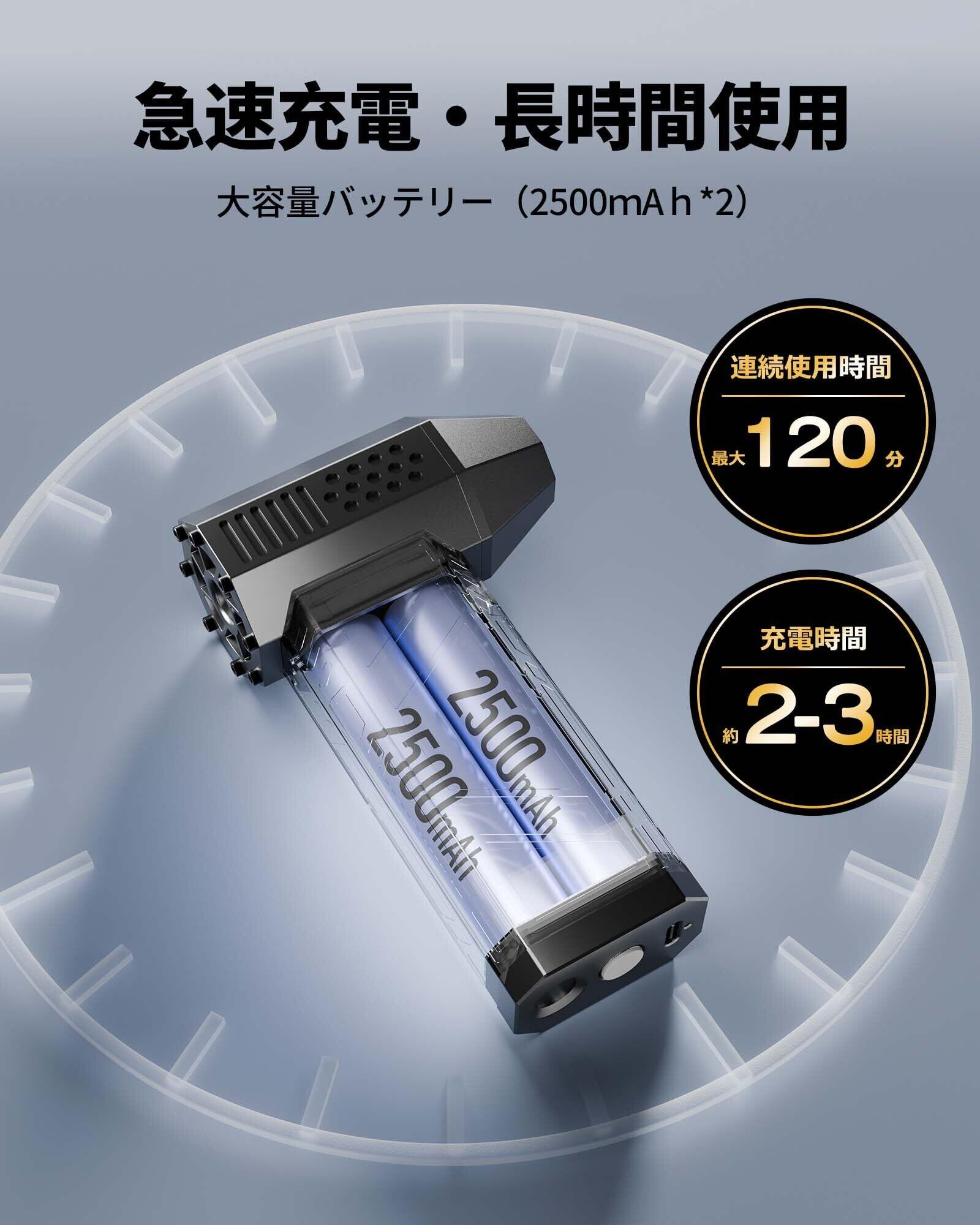【5000mAh大容量バッテリー・安全安心】従来2000mAh容量電池と比べて、KOJIHOMU電動エアダスターはバッテリー容量2倍以上!フル充電しなら、最大約120分で使用できます。また、加熱保護のために、中風と強風モードで10分後に電源を自動的にきれます。