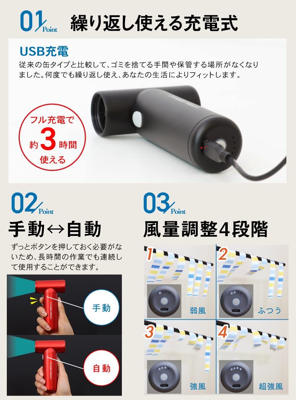 【充電式 / 自動・手動切り替え可能 / 風量調整】繰り返し使える充電式で、使いたい時にいつでも簡単に使用できます。手動だけでなく、ボタンを押さなくても使える自動モードにも切り替えることが可能です。風量は4段階調整することができるため、使用シーンに合わせて風量を選べます。