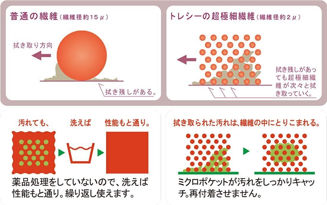 東レのトレシーは、ふつうの布では落し切れない油膜汚れなどをきれいに拭き取る、