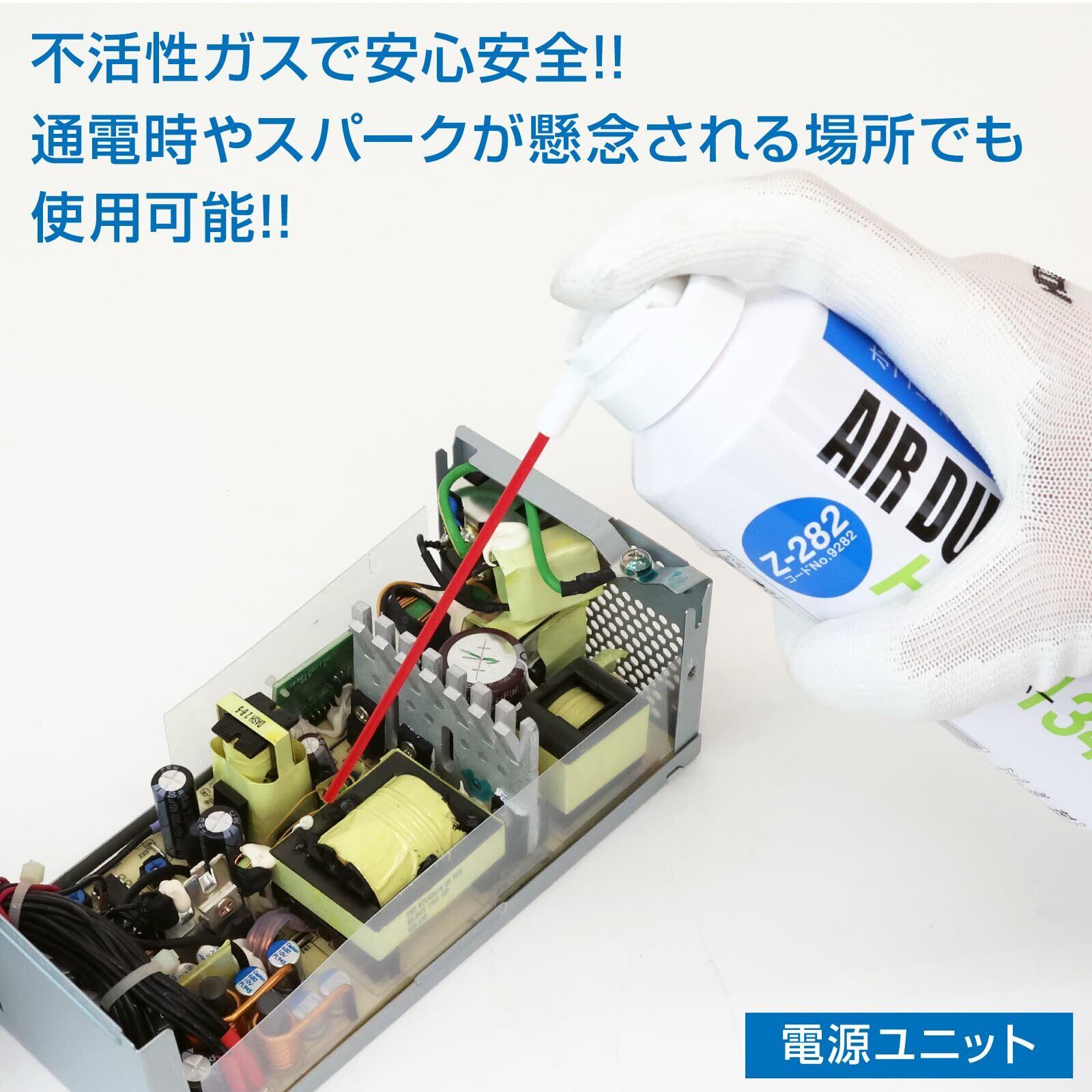 通電中の電気機器や気密性の高い電気機器のような、火花などで引火の恐れのあるところで安全に使える携帯に便利なエアダスターです。
