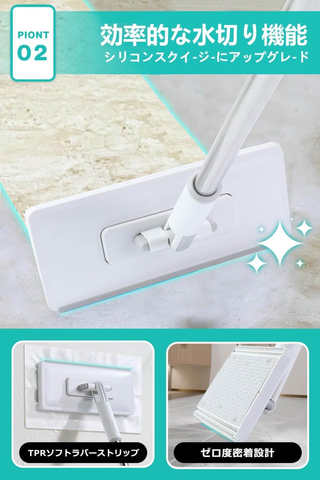 【優れた水切り機能】このモップは、シリコンスクイージーとTPRソフトラバーストリップを採用しており、効率的な水切り機能を提供します。水や湿気をすばやく取り除き、拭き跡を残すことなく、床やガラスをきれいに仕上げます。特に、ガラスやタイルなどの硬い表面の清掃において、その効果を発揮します。水分や汚れがしっかりと拭き取られることで、掃除後の仕上がりがより清潔で美しくなります。家庭の床掃除はもちろん、キッチンやバスルーム、さらには窓ガラスの掃除にも最適です。シリコンとTPR素材による高性能な水切りが、使うたびに満足感を提供します。