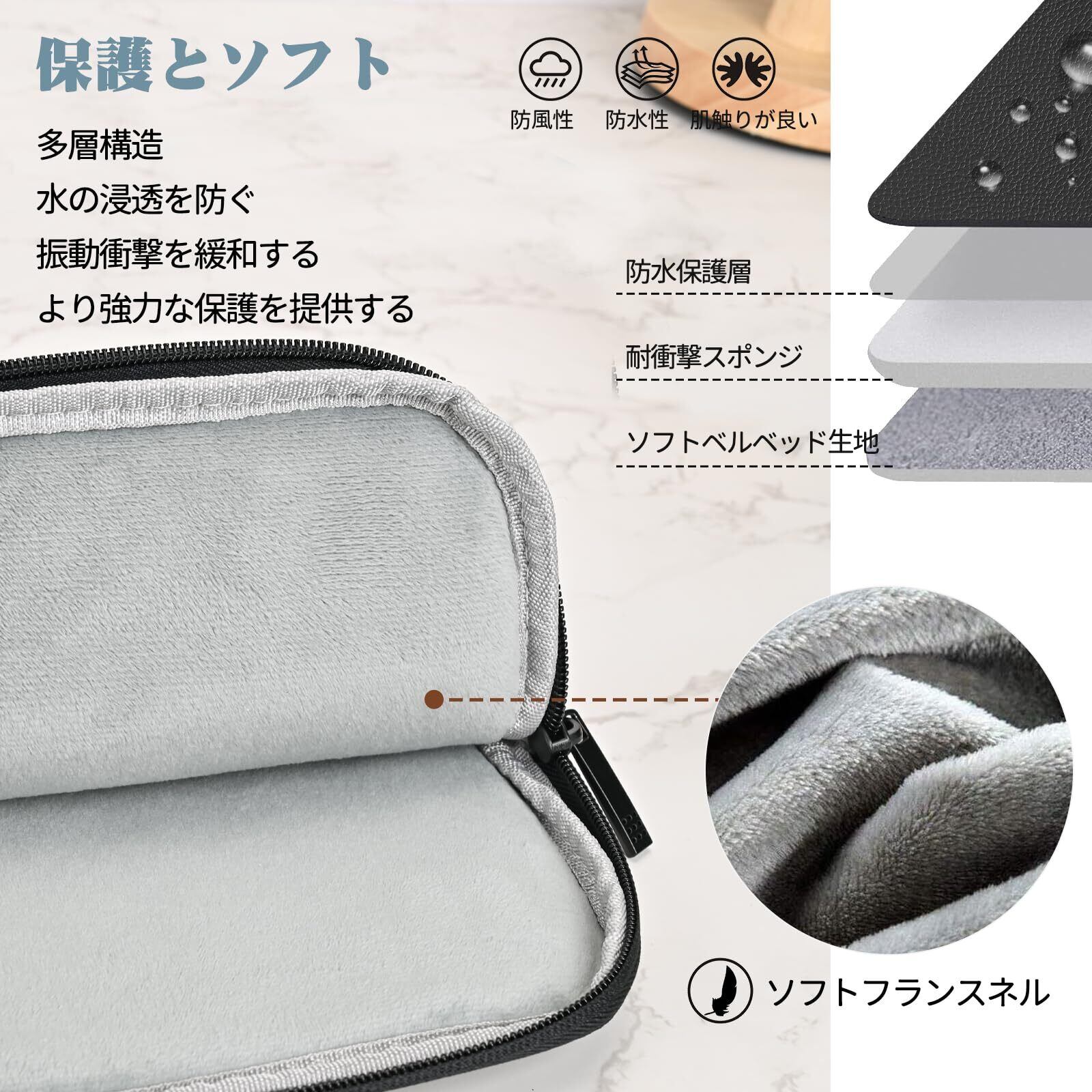 【360°全方位保護】:タブレットケース内部の厚くてふわふわしたクッションは衝撃吸収効果に優れています。 ジッパーの周りに保護パッドも付いており、傷を防止し、大切なタブレットを保護します。 耐水性のあるPU生地は見た目以上に耐水性があります。 多少の汚れがついても拭くだけで簡単に取れます。 雨や雪からの水が浸入せず、大切なタブレットや周辺機器を濡れから守ります。
