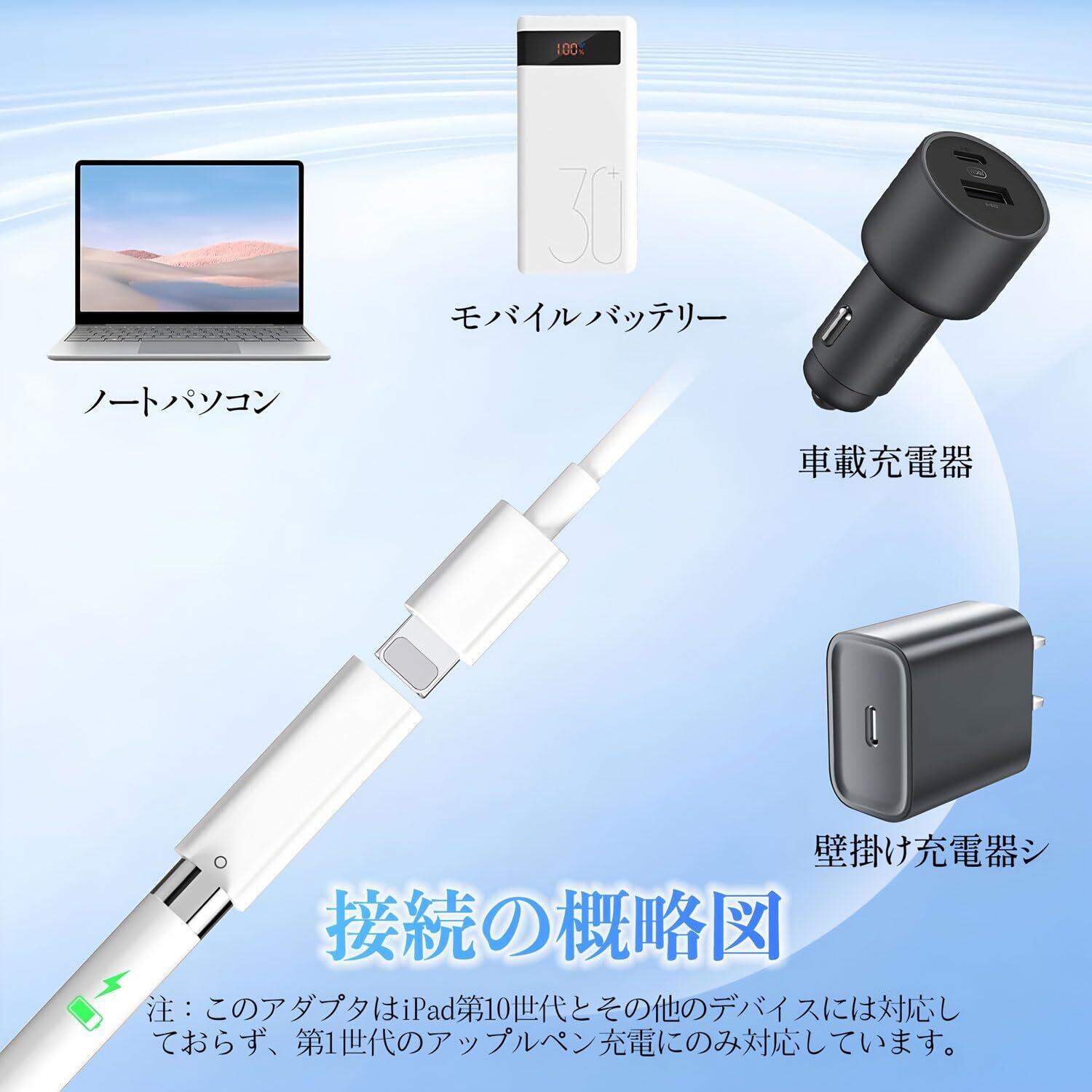 【充電時の注意点】このアダプターはApple Pencil 1世代のみ対応。iPad第10世代や他機種とは互換性がありません。充電時はUSB電源アダプタ/PC/モバイルバッテリーをご利用ください(iPhone/iPad経由不可)。
