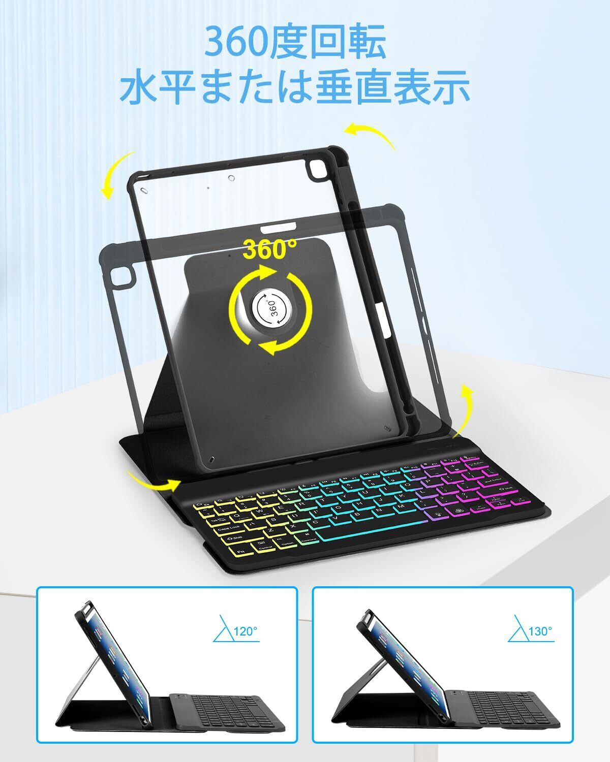 EAMPANG JIS日本語配列 iPad 第9世代/8世代/7世代 10.2インチ/Air 3/Pro 10.5 キーボード付きケース, 7色レインボーバックライト Type-C充電 脱着式 スマート 多機能 ワイヤレス キーボード 360度回転 横置き縦置きの立ち方 磁気ケース軽量全面保護多角度調整鉛筆ホルダー付き(ブラック) 日本語取扱説明書付き