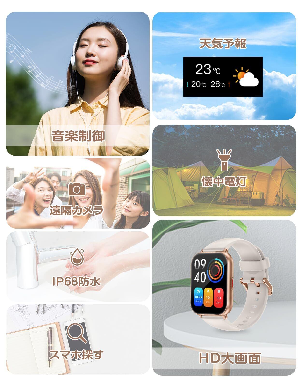 【実用な機能満載&IP68防水】 毎日の歩数や距離、記録するだけでなく、座りがち注意、リラックス機能も備えています。女性の月経周期の記録と通知機能も揃えます。スタイリッシュなデザインは職場や生活の中でレディースもメンズも使用いただけます。スマホ探す、リモコン撮影 、アラーム、タイマー、ストップウォッチ、腕上げ点灯、画面の明るさ調整、おやすみモード、天気予報、懐中電灯、音楽コントロール、多言語対応などの便利機能が満載!IP68規格の防水・防塵性能を持ち、日常生活での手洗いや洗顔の際に取り外す必要がありません。注意:ダイビングや海水浴、サウナでの使用は避けてください。