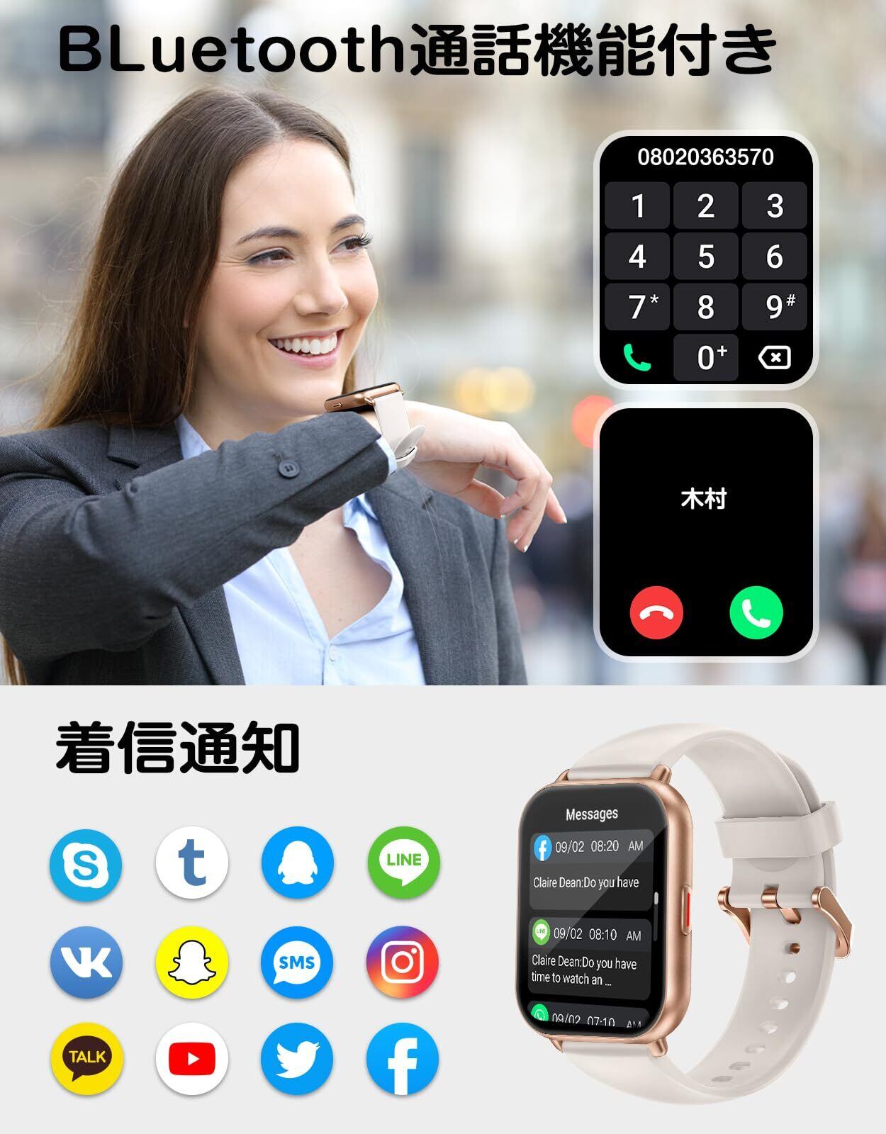 【Bluetooth通話機能付き&着信通知】スピーカーと高性能マイクを内蔵し、スマホを取り出すことなく通話ができるスマートウォッチで、毎日の仕事や生活、ドライブに大きな利便性を提供します。専用アプリと接続すると、スマートウォッチから直接電話をかけたり、応答したり、スピーカー機能をオンにしたりできるほか、通話履歴の確認や通話履歴の保存も可能です。 通話相手の名前と電話番号が時計に表示されます。また、smart watchには音声アシスタント機能が搭載されています。 さらに、LINEやFacebook、Twitterなどの通知もお知らせしてくれるので、大切なメッセージを見逃すこともありません。通知の振動の強さは、時計側で設定できます。