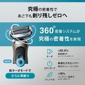 忙しい朝も、素早く剃り残しゼロへ。ブラウンの密着シリーズが進化して登場。毎朝、出かける前のお手入れとして欠かせないシェービング。時間がない忙しい朝にも素早くシェービング可能なターボモードを新しく搭載。パワー&スピードアップで時間の無い朝のタイミングでも快適に深剃りし、すべすべ肌を実現します。選べるシェービングモードでパワーを最適化。新しくなったブラウン密着シリーズはシェービングモードが選択可能。電源ボタンの下にあるスイッチを押すことでモードを変更し、シチュエーション、用途に合わせて最適なパワーでシェービング可能です。忙しい朝には、ターボ―モードを選択して、パワー&スピードアップ。回転数が最大28.5% も上昇することで、髭剃り効率がアップし、素早く深剃りが可能に。肌を労わりたい、そこまでヒゲが濃くないケースではジェントルモードを選択することで、回転数を落とし、必要最低限に最適化されたパワー&スピードで、肌に優しいシェービングを可能にします。またジェントルモードを使用することでバッテリーが長持ち。1回の充電でより長くシェーバーをご死傷いただけます。究極の密着性で、あご下でさえ、剃り残しゼロへ。毎日のシェービングの中でも、最も剃りずらい部分であり、日中にジョリっとして剃り残しが気になるあご下。ブラウンの密着シリーズなら難しいあご下でさえ密着し、剃り残しゼロへ。