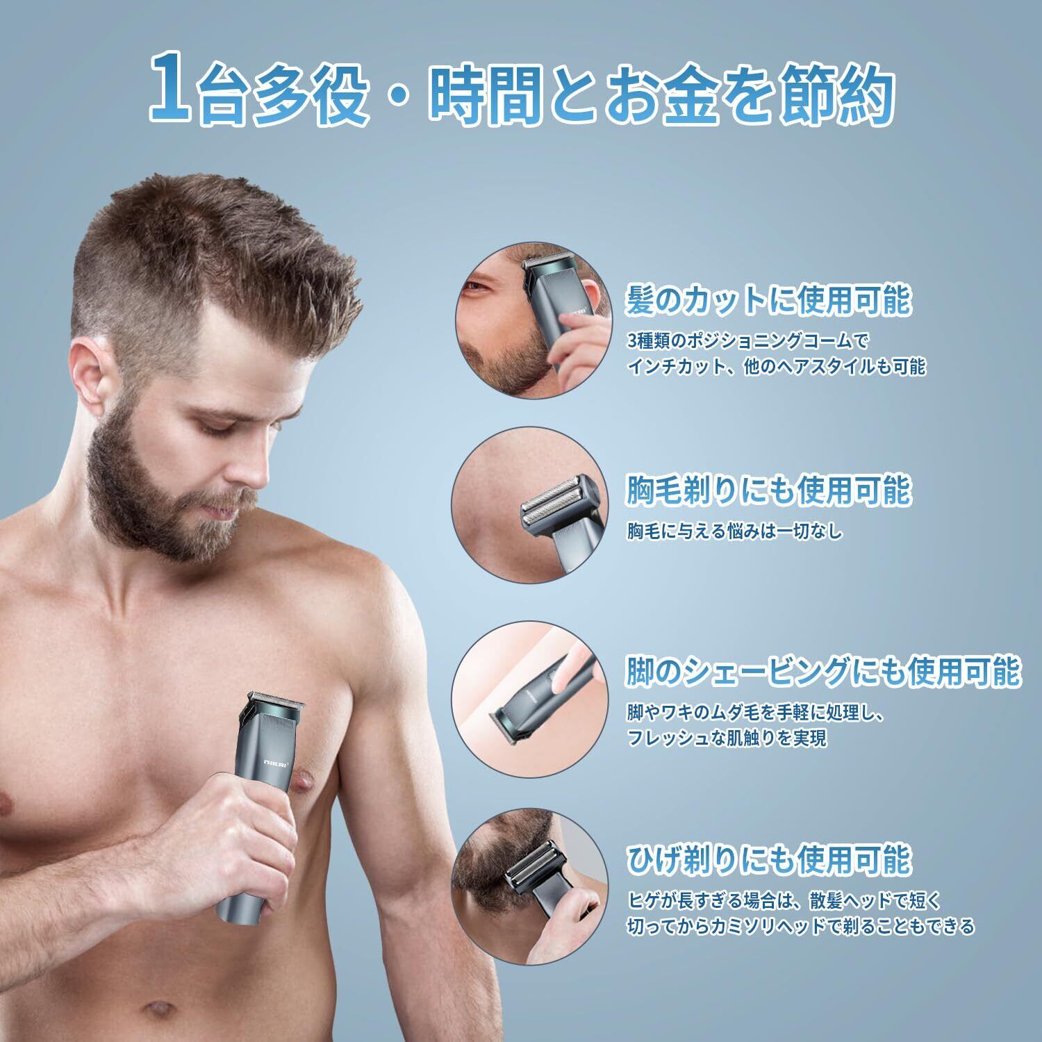 シェーバーメンズ ボディシェーバー 電気シェーバー バリカン 鼻毛カッター ヒゲトリマー 髭剃り 1台3役 多機能セット 腋毛/体毛/眉毛/すね毛/髪/フェイス用 Type-C USB充電式 LEDインジケータ 乾湿両用 日本語取扱説明書 2023革新モデル