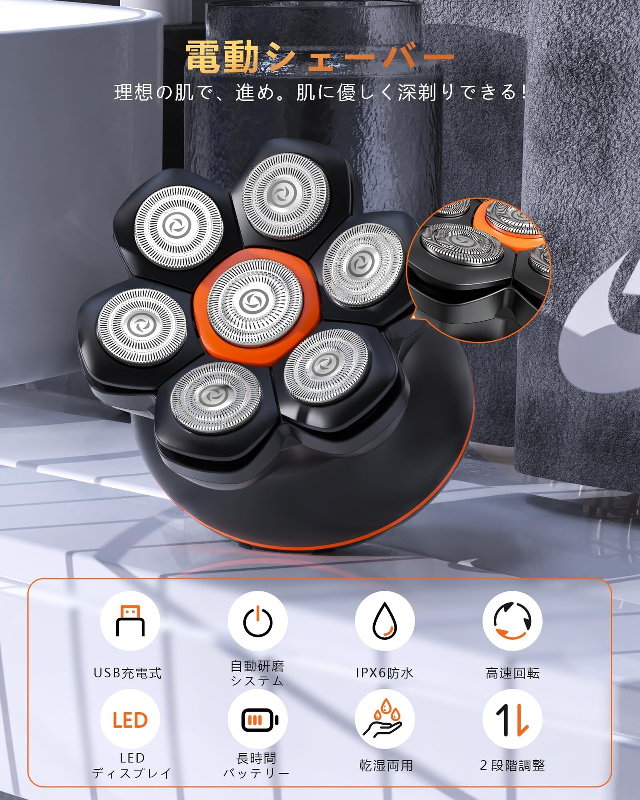 [7D回転式・極薄メッシュ刃]スキンヘッド シェーバー は上下·左右に浮き沈みする7つの独立した刃で肌への負担を軽減し、顔、顎の輪郭の曲面や小さな起伏を密着することで効率的に剃り切ります。自動研磨システムが搭載され、使うたびに内刃が外刃と磨かれ、常にシャープな切れ味。高品質ステンレス鋼製刃も採用され、耐久性が優れています。